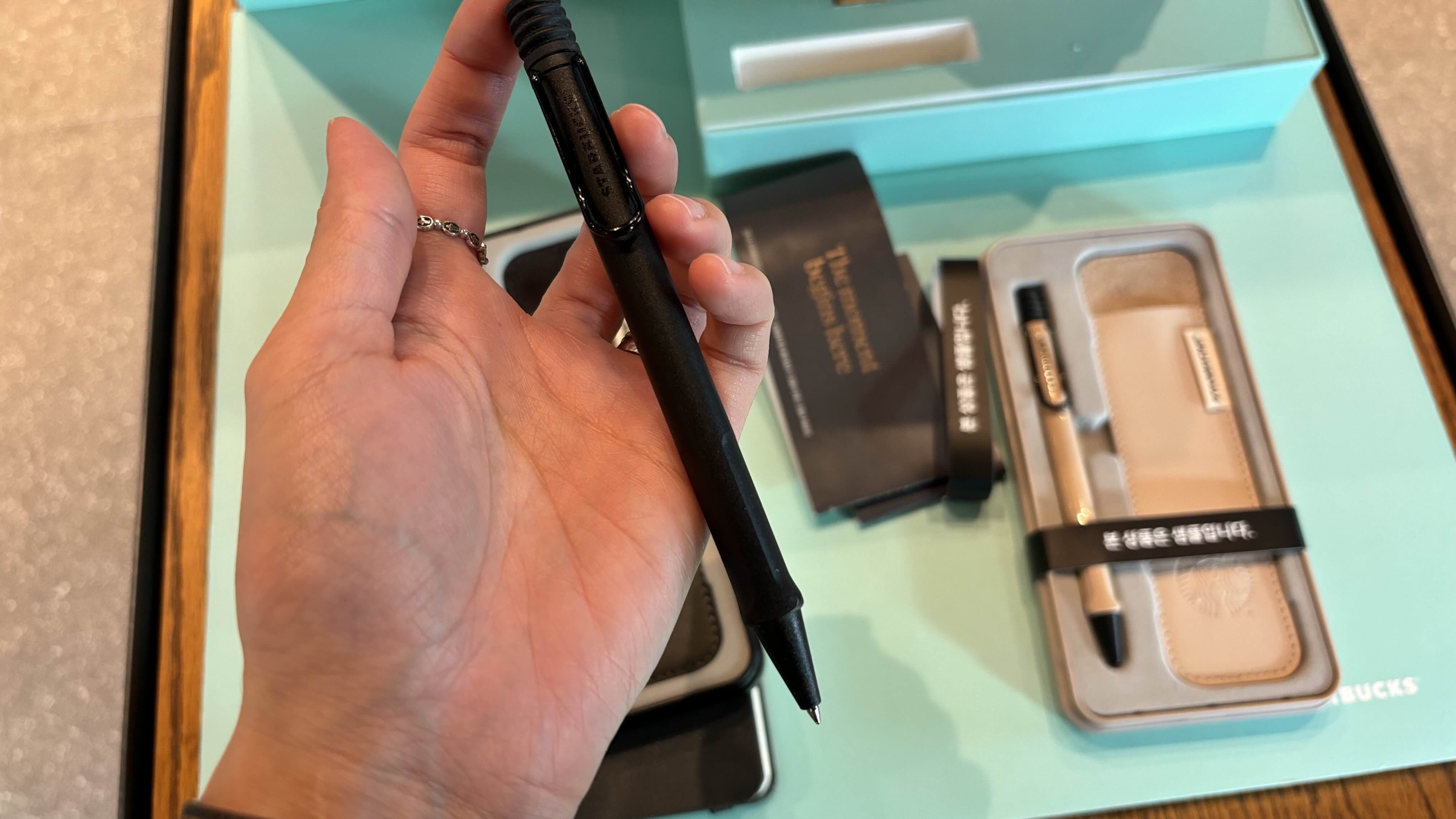 라미펜은 블랙 색상과 베이직 색상 있습니다 사진으로 봤을 때는 베이지가 무조건 너무 너무 예쁘다 했지만 실물을 보니까 블랙이 훨씬 깔끔하고 이뻐 보였습니다 사실 조금 충격적이었던 건 라미 팬이 볼펜이었다는 겁니다 저는 잉크 팬으로 조금 더 고급 지게 맛있을 거라고 생각했는데 일반볼펜인 점은 조금 아쉽지만 스타벅스 로고가 박혀 있는 볼펜이 사실 고급스럽게 느껴지기는 합니다 심지어 라미 펜이니깐 필기감이 매우 좋겠지요