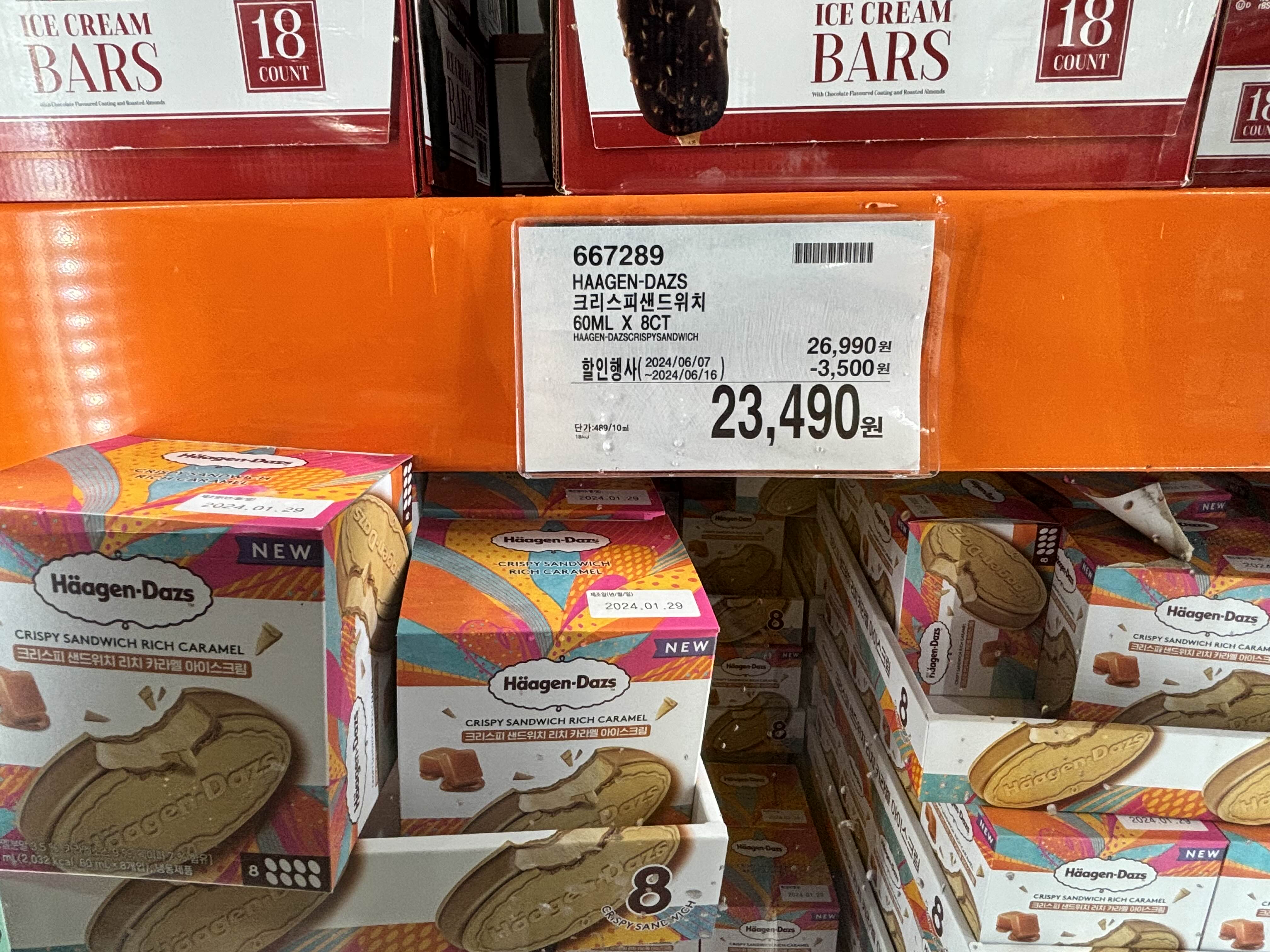 기본적으로 코스트코에서는 8개 묶음로 26,990원입니다. 이경우 3,373원입니다. 그치만 지금은 여기에 3,500원 할인이 붙었습니다. 그렇개 되면 하겐다즈 샌드 8개 묶음 23,490원입니다. 2,936원입니다