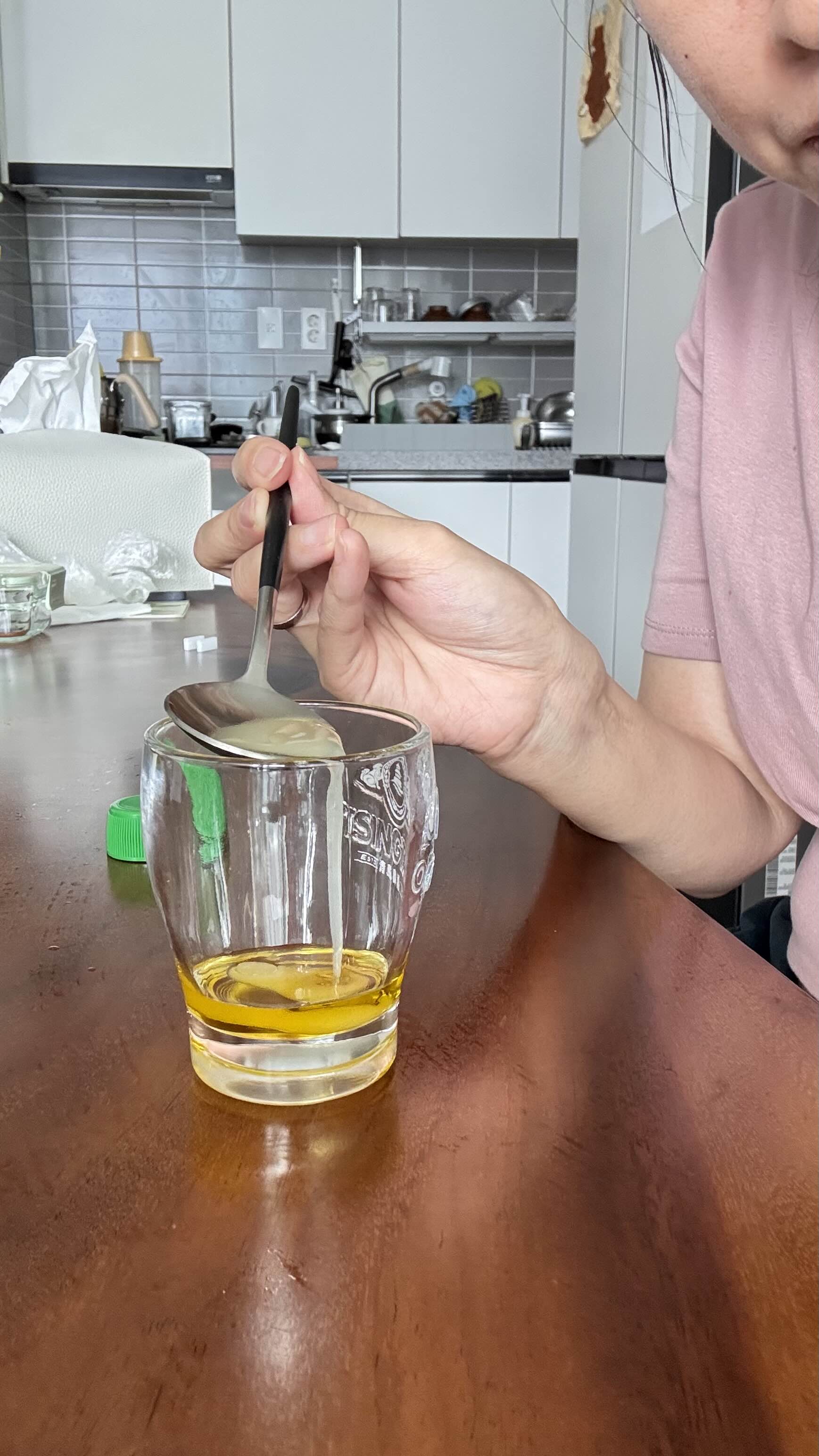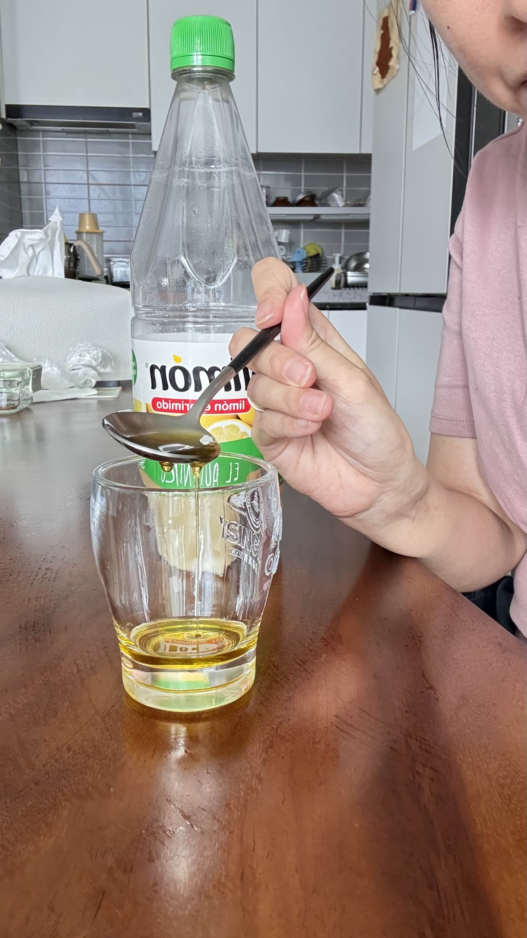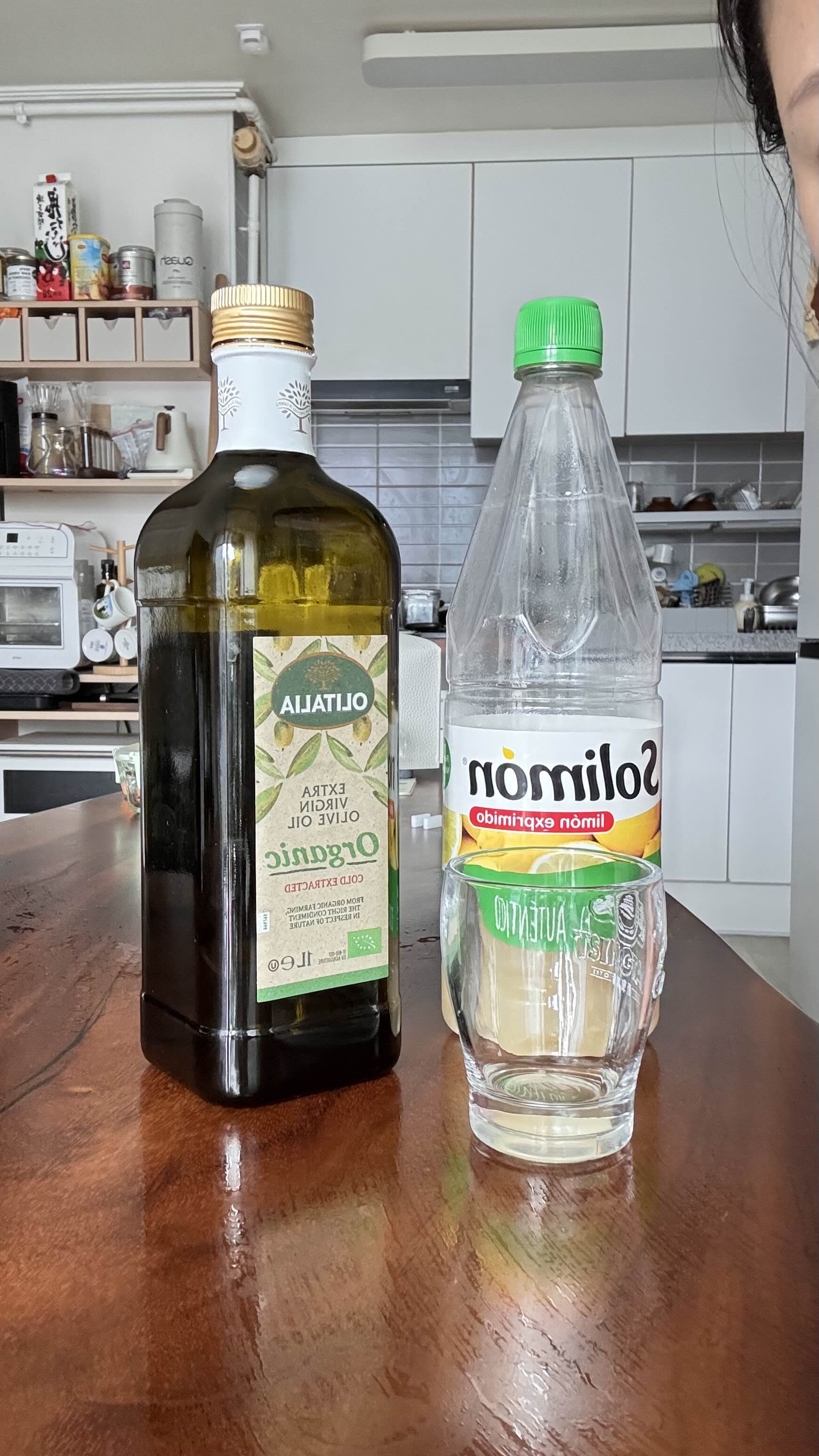 • 일어나자마자 물 한 컵 마신 뒤, 올리브유 + 레몬즙을 먹어요.