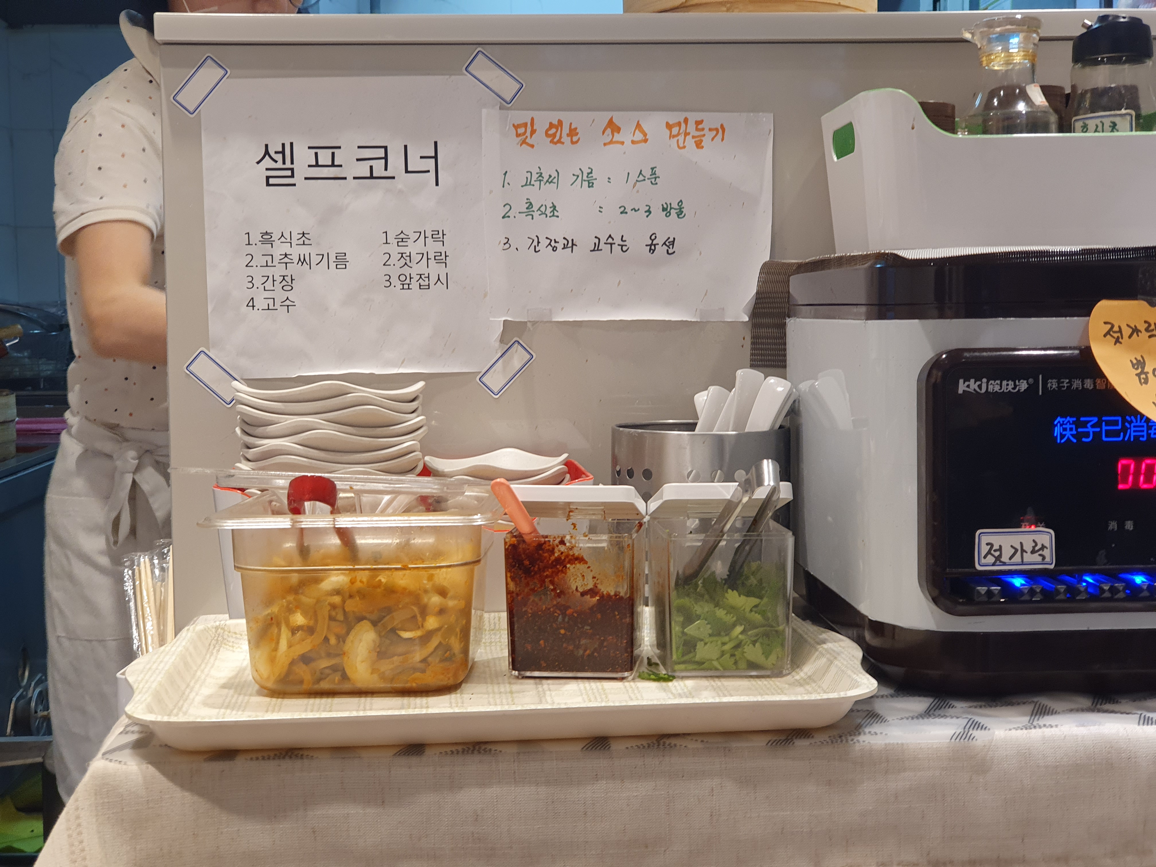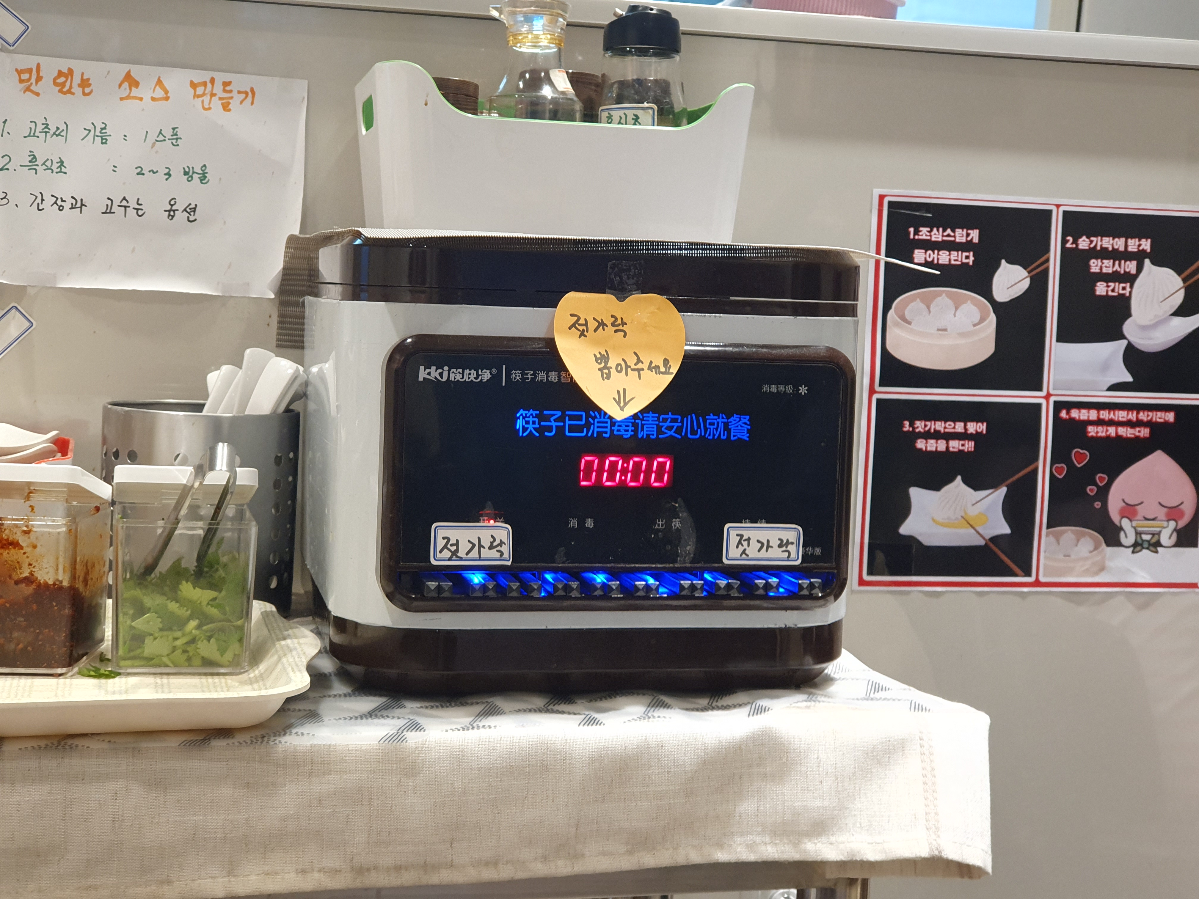 그리고 그 옆에 이게 무언고 하니 젓가락 살균기였습니다. 살균된 젓가락을 하나씩 가져갈수 있는 시스템이었습니다. 요즘 중국에는 이런 최신 문물도 있나바요. 정말 신기했어요.