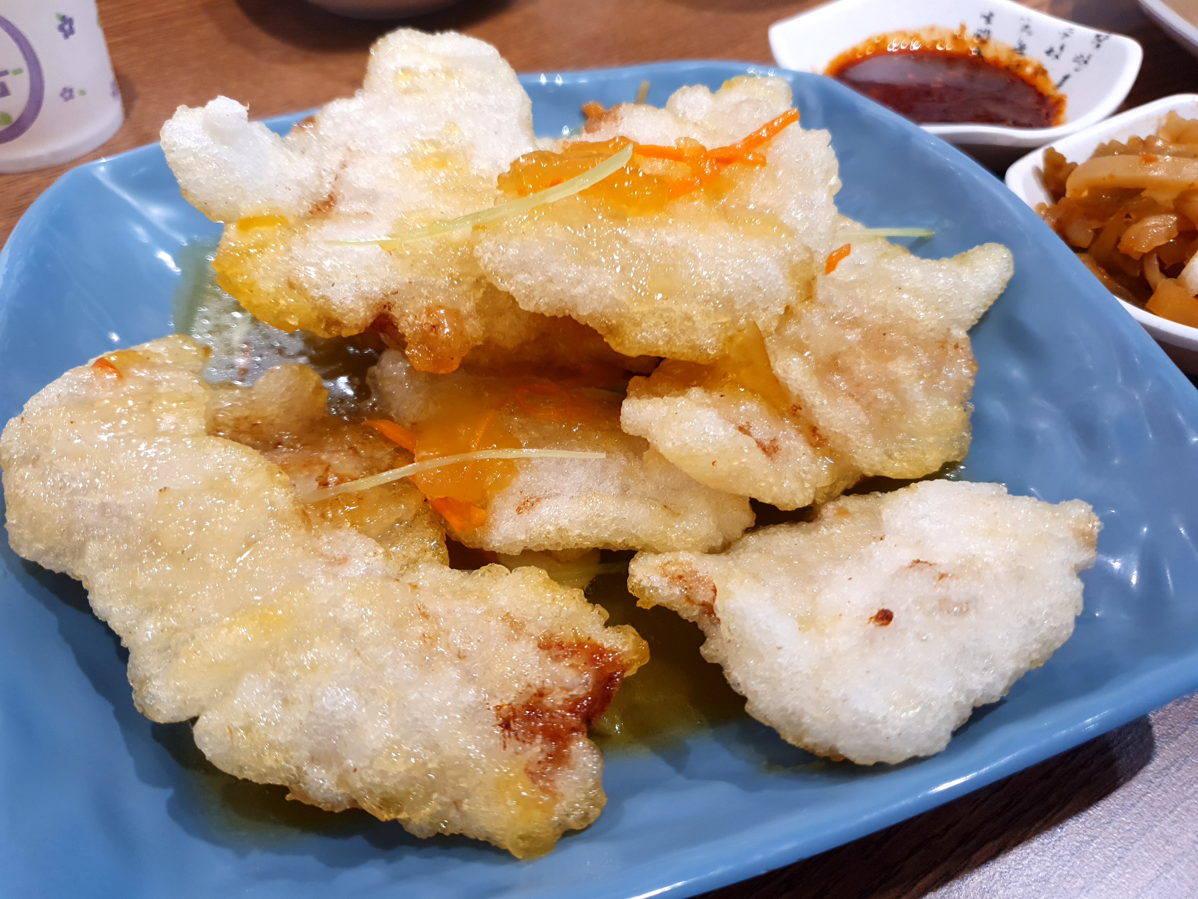 바로 이러서 꿔바오로우도 나왔습니다. 깨끗한 기름에 갓 튀긴 돼지고기가 매우 고왔습니다.