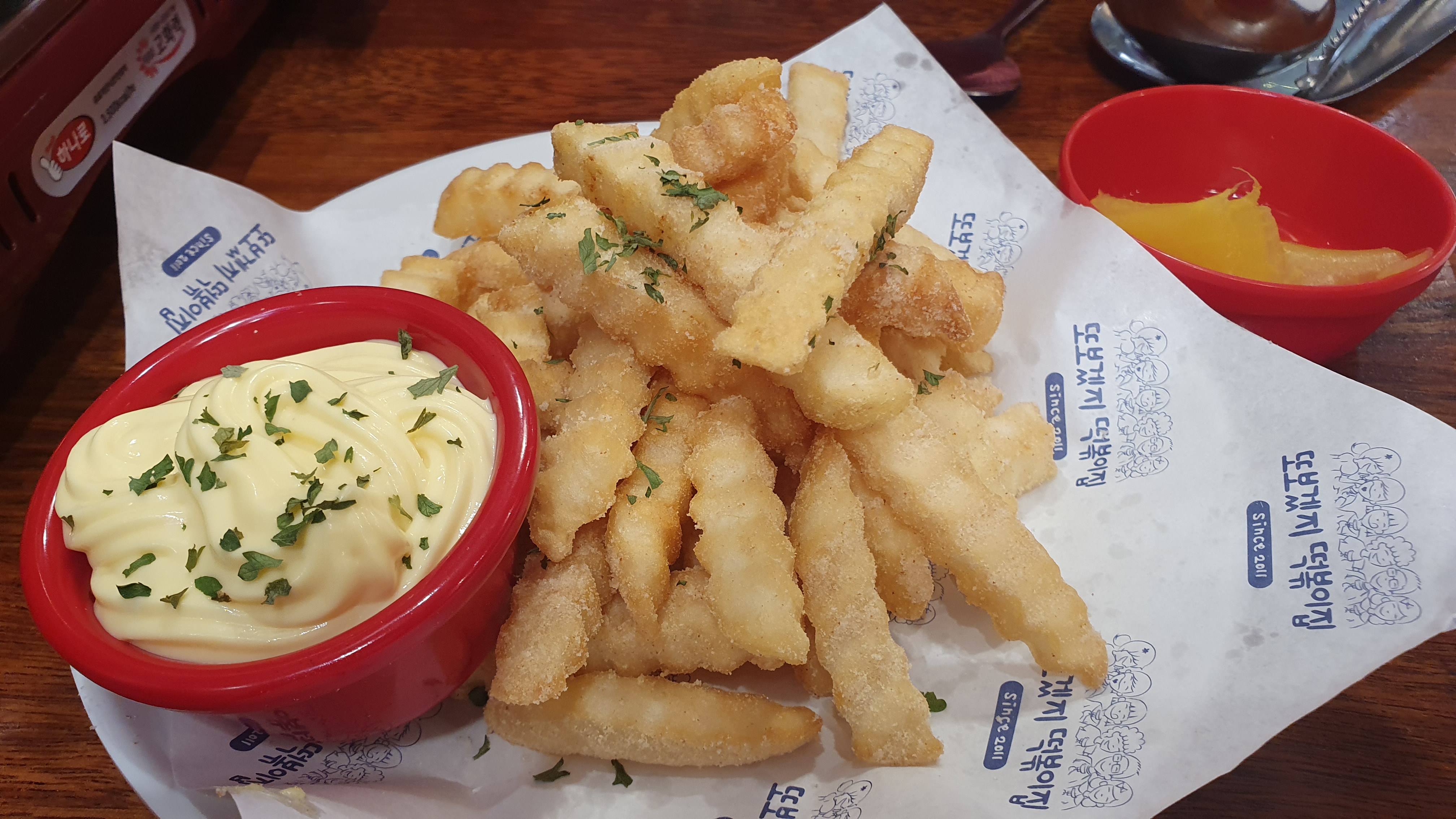 그리고 버터갈릭 감자튀김!! 후후 이곳은 감자튀김. 포테이토 맛집이라고 할 수도 있죠. 그런데 처음 왔을 때는 잘 몰라서 안시켜먹었었어요. 떡볶이도 충분히 맛있고 양많고 칼로리도 높은데 구지 감자튀김을 시켜야하나. 감자튀김은 맥도날드가 최고지! 왜 떡볶이 맛집에서 감자튀김을 먹나 하는 생각을 했었습니다. 그러던 어느날. 옆 테이블에서 이쁜 언니들 두명이 감자튀김을 각 1개씩하고 있는 명장면을 보았습니다. 그때 인지했습니다. 이건 무조건 먹어야 하는 구나 하고 말이죠.