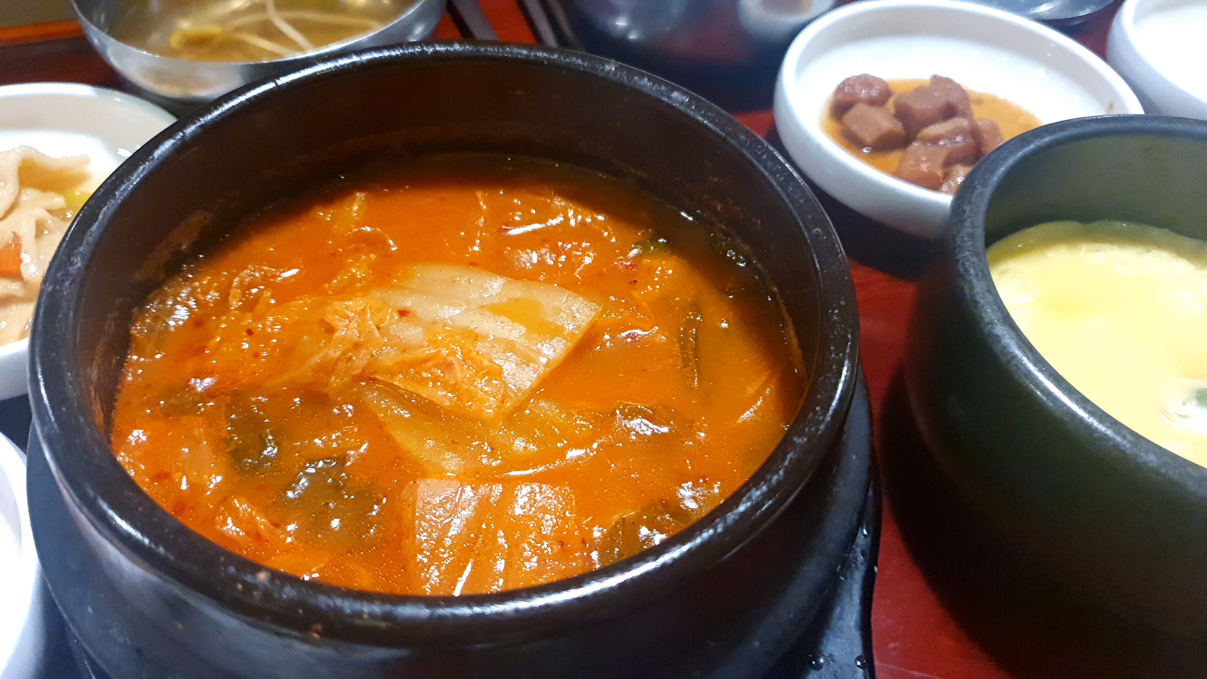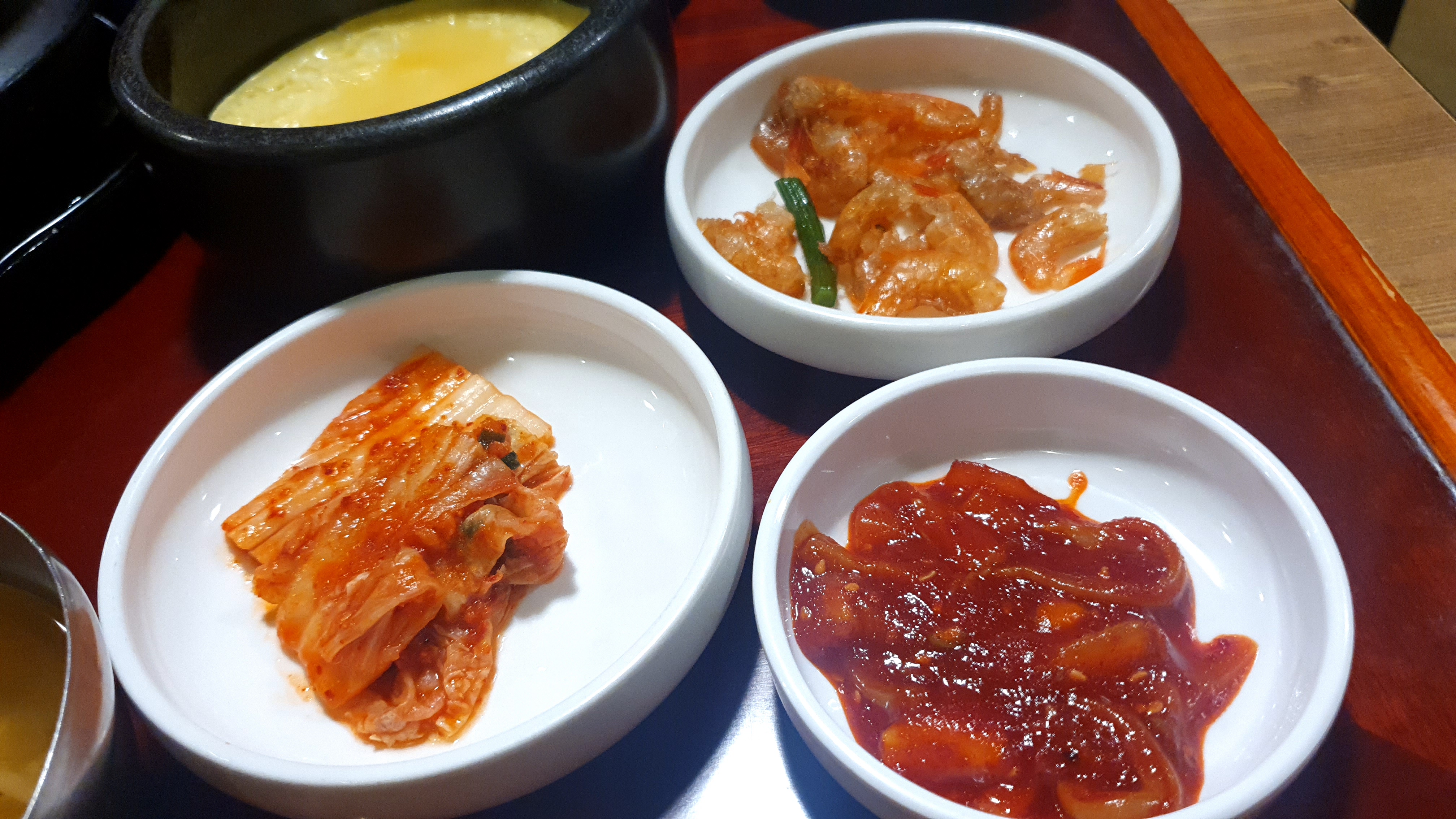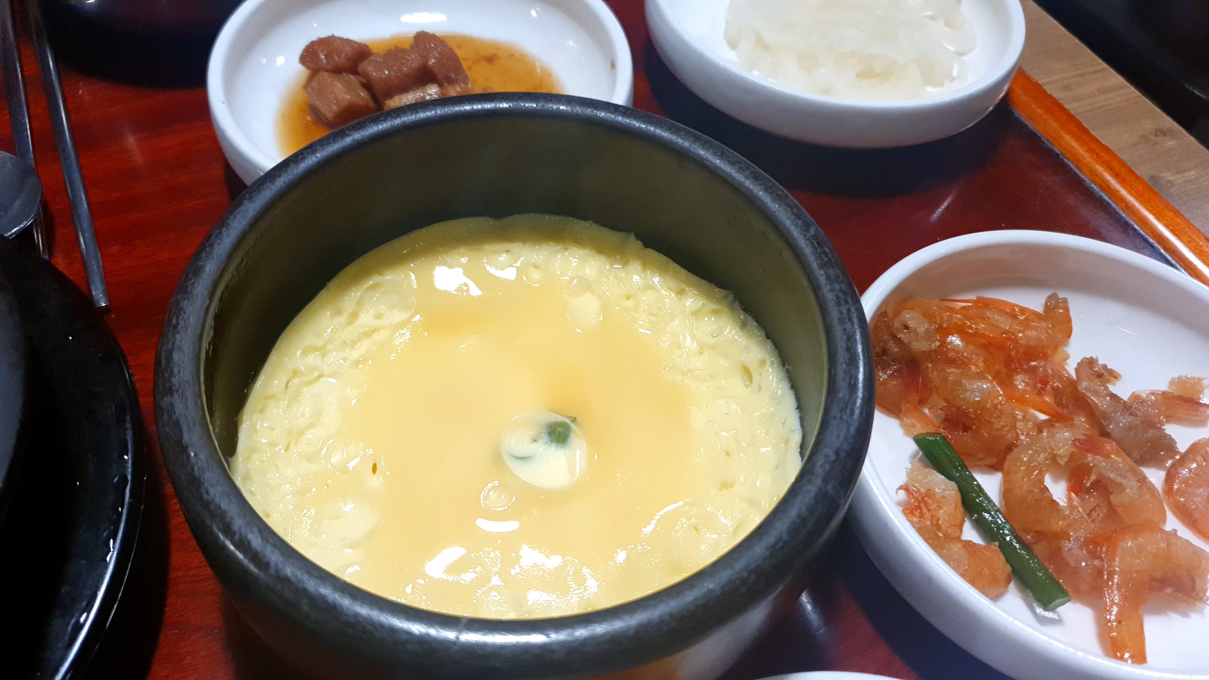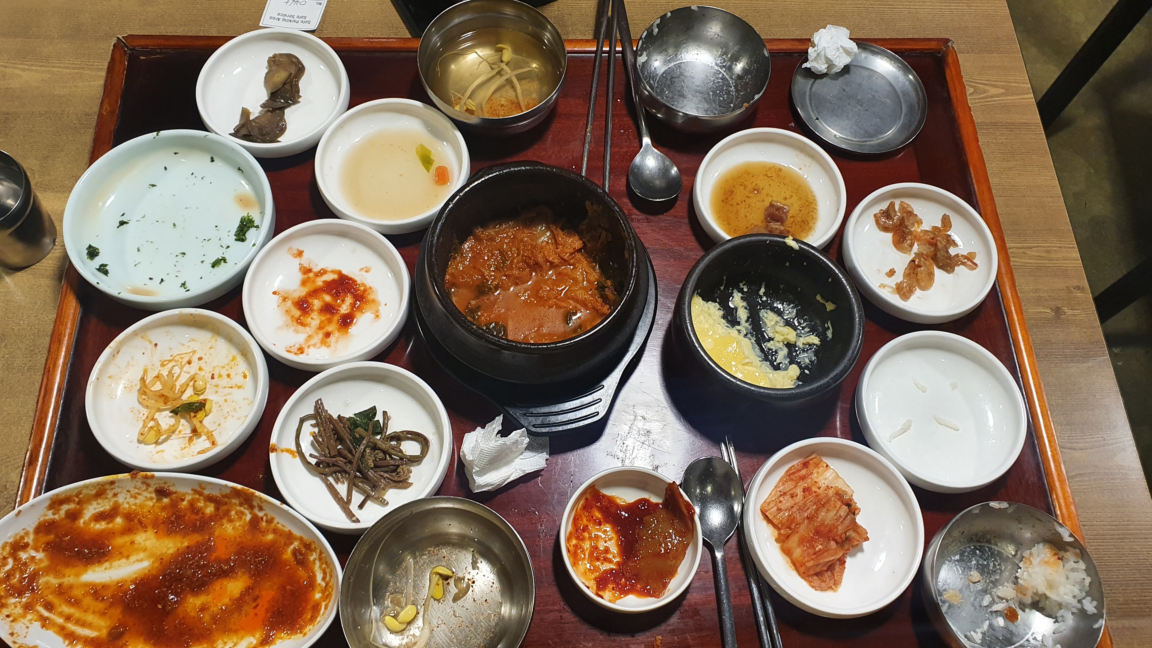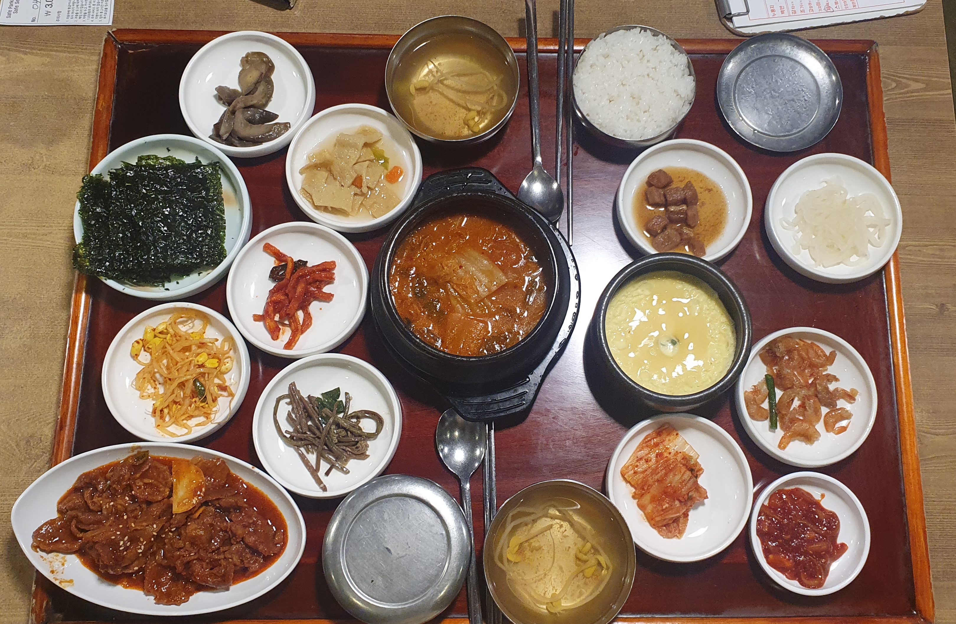 주문한지 얼마 지나지 않아 바로 한상 차려 나오네요. 배가 정말 고팠는데 바로 먹을 수 있어서 좋았습니다. 기본찬에는계란찜과 김치찌개, 오징어젓갈, 김, 오뎅, 무나물, 건새우조림, 가지볶음, 고사리무침, 콩나물국이 나왔어요. 그리고 4천원에 추가한 제육볶음을 함께 먹었습니다. 간이 다 딱 좋았어요. 옆 테이블에 있던 남성 두분은 저희보다 바로