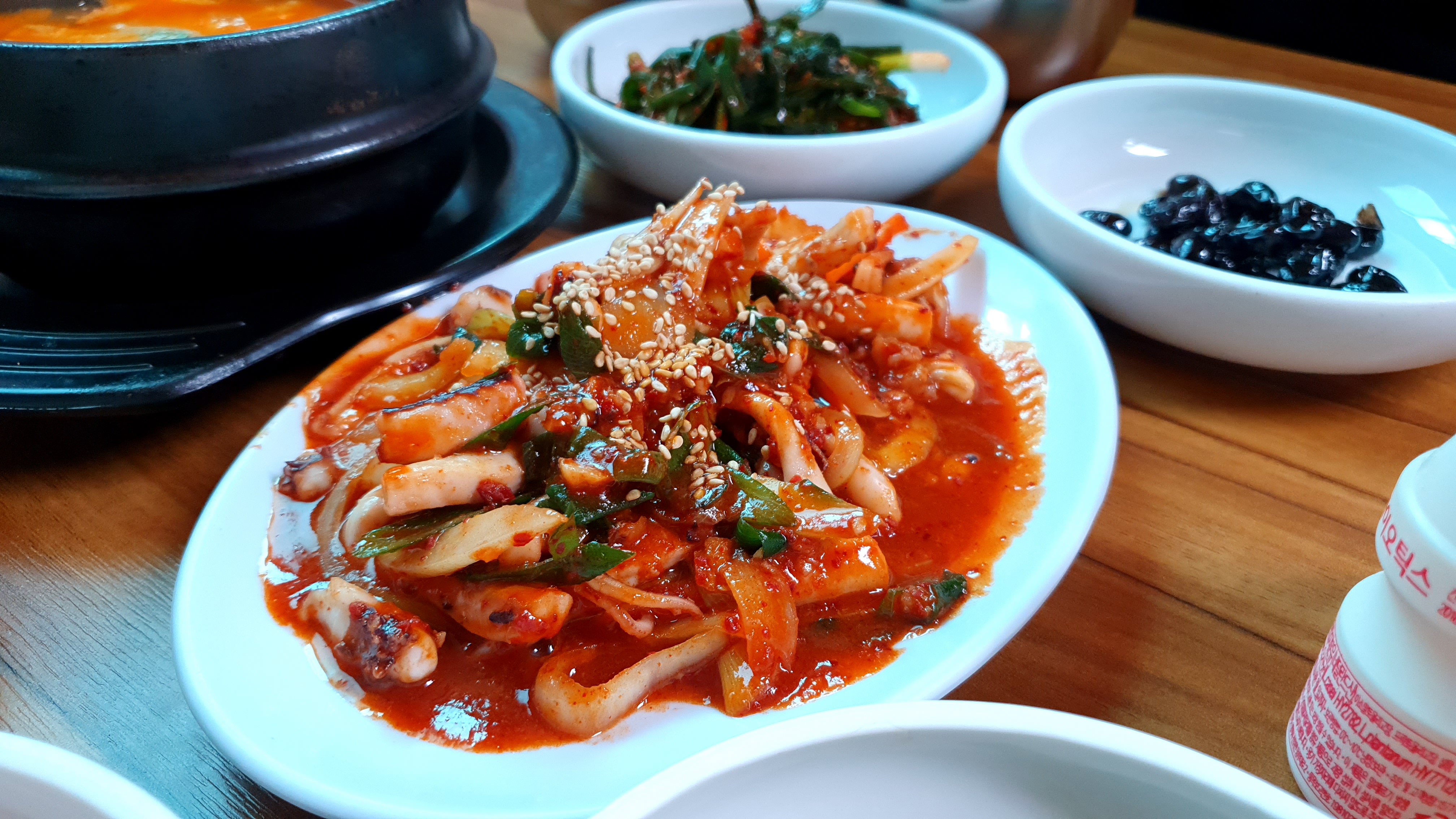 순두부찌개는 처음에는 몰랐는데 안에 반숙 계란이 있었더라구요. 그래서 더 맛있게 먹을 수 있었습니다. 그리고 오징어볶음은 아주 야들야들 맛있게 볶아내었습니다. 오징어 전혀 질기지 않고 입에서 녹는 느낌이었어요. 게다 빨간양념이 적절하게 매운게 아주 제 스타일이었습니다. 그래서 밥에 비벼서 순삭했습니다.