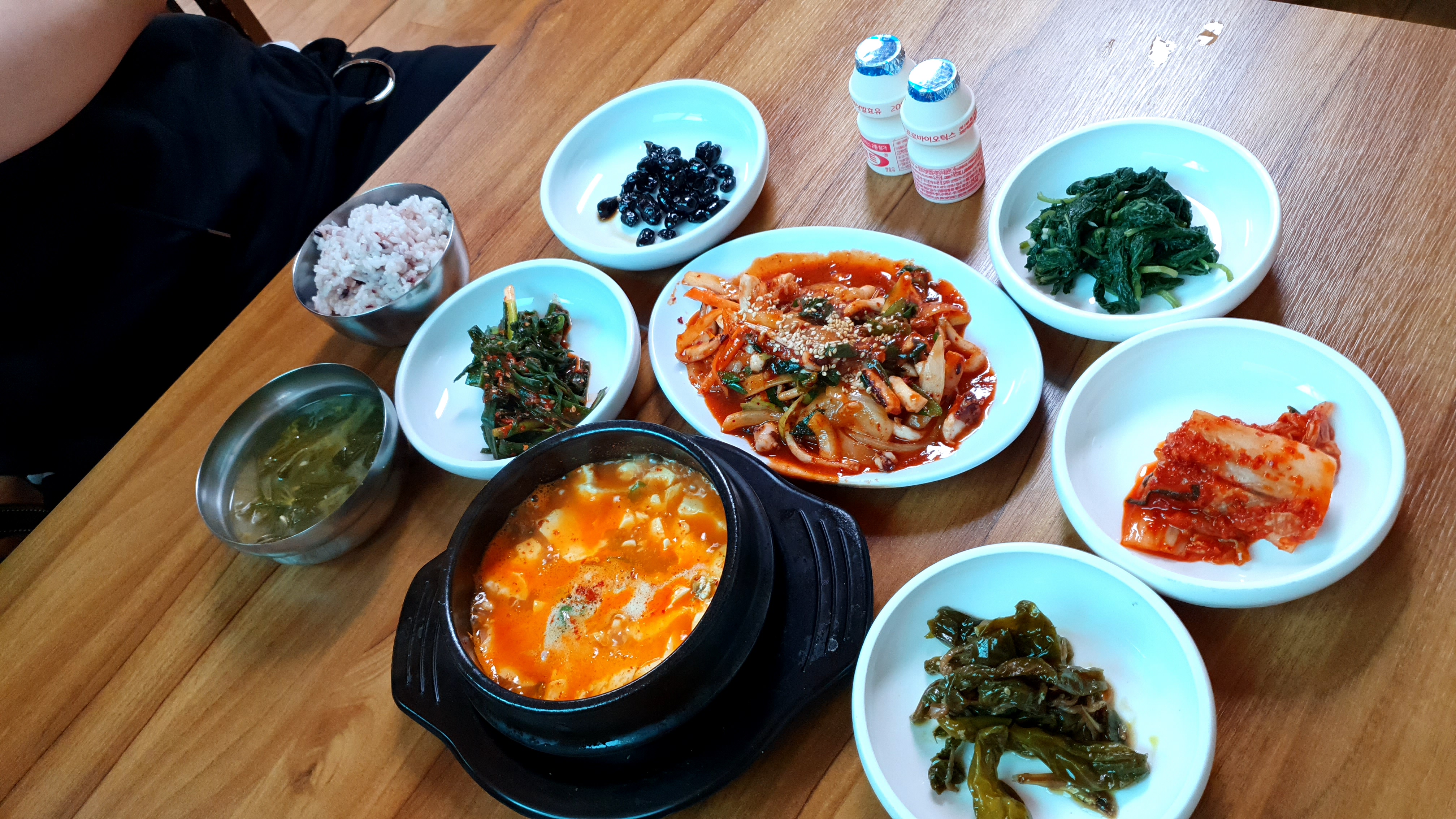 착석하니 상이 금방 차려졌습니다. 매인으로 순두부찌개와 오징어볶음이 나오고 깻잎나물,배추김치,콩자반, 파김치, 시래기국, 고추절임이 나오네요. 반찬에 흔한 계란말이나 오뎅이 없음에 조금 섭섭했지만 음식이 매우 맛있습니다. 저도 밥한공기를 뚝딱했네요. 밥공기가 조금 작기는 했어요. ㅎㅎ