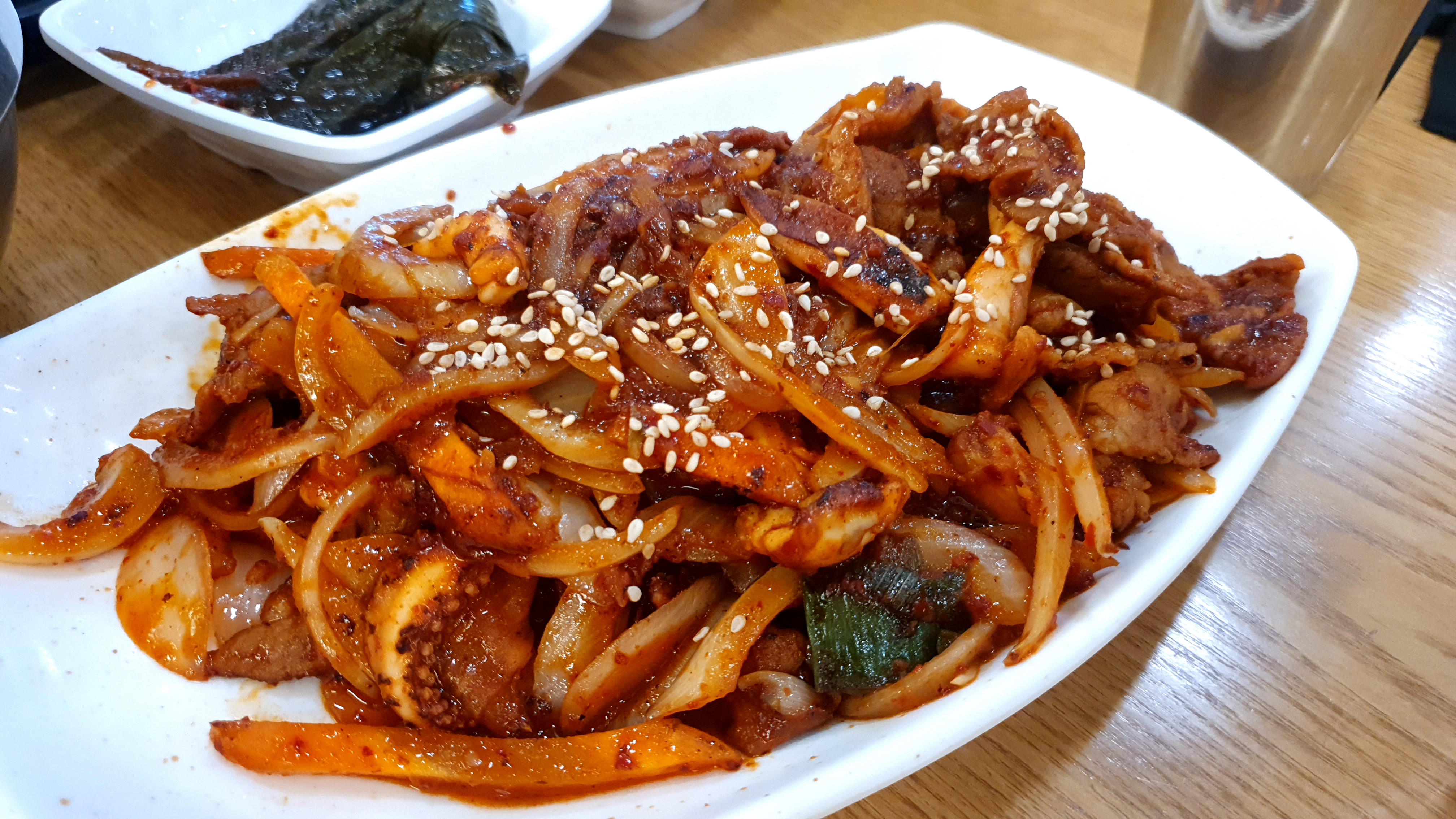 제육과 오징어를 섞은 섞어직화입니다. 오징어는 적당히 쫄깃하고 제육은 큼지막히 썰어 씹는 맛이 있어요. 그리고 불맛을 충분히 내어 정말 맛있네요. 강남 한복판에서 가성비 좋은 음식을 만나서 기분이 좋았습니다. 최근에 청하식당에서 먹은 오징어와 비교하면 불맛을 좀 더 낸거 같았지만 오징어의 부드러움은 청하식당이 더 좋았습니다.