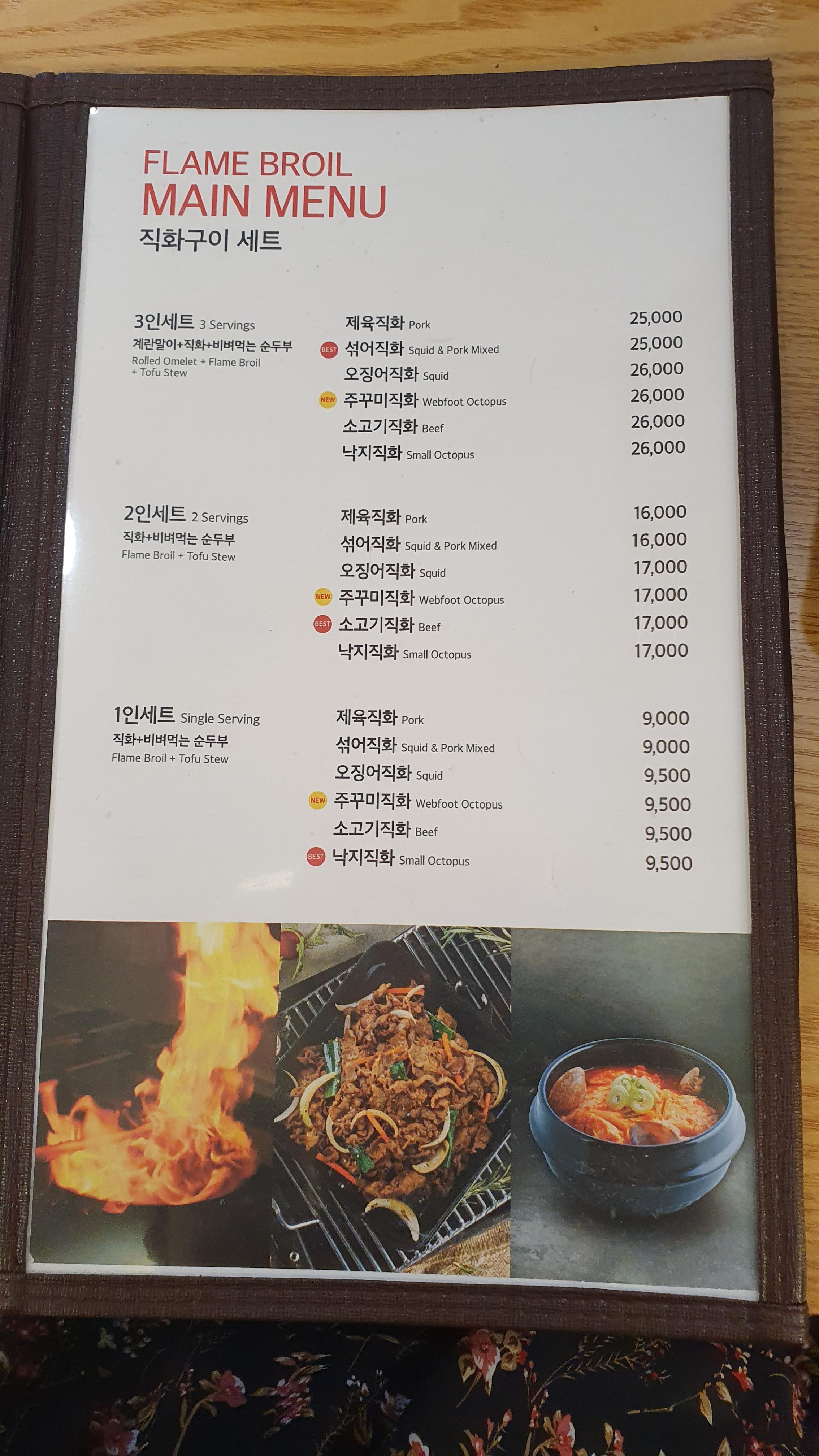 소공동뚝배기집의 메뉴판입니다. 이 집은 직화구이와 순두부 전문점입니다. 오징어, 제육, 낙지, 쭈꾸미, 소고기중에 고를 수 있습니다. 오빠랑 저는 섞어직화를 주문했습니다. 섞어직화는 제육과 오징어가 반반 나와요.