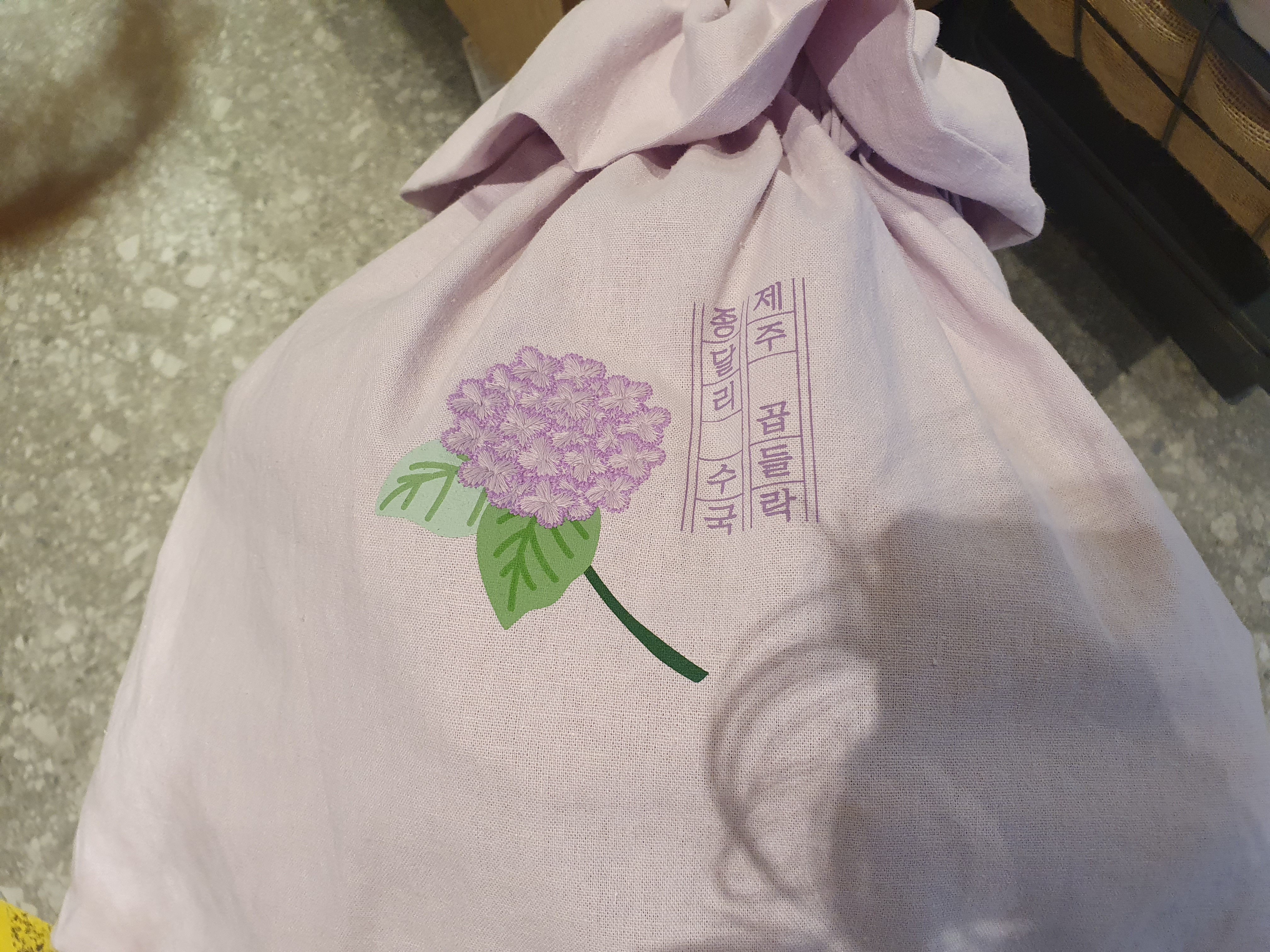 이번에는 종달리 수국이 그려져 있는 에코백입니다. 이 제품 역시 라벤더 색상이 매우 고와요. 에코백 상단을 묶을 수 있어서 안에 내용물이 쏟아지지 않게 들고 다닐수 있어서 참 실용적인 가방이예요.