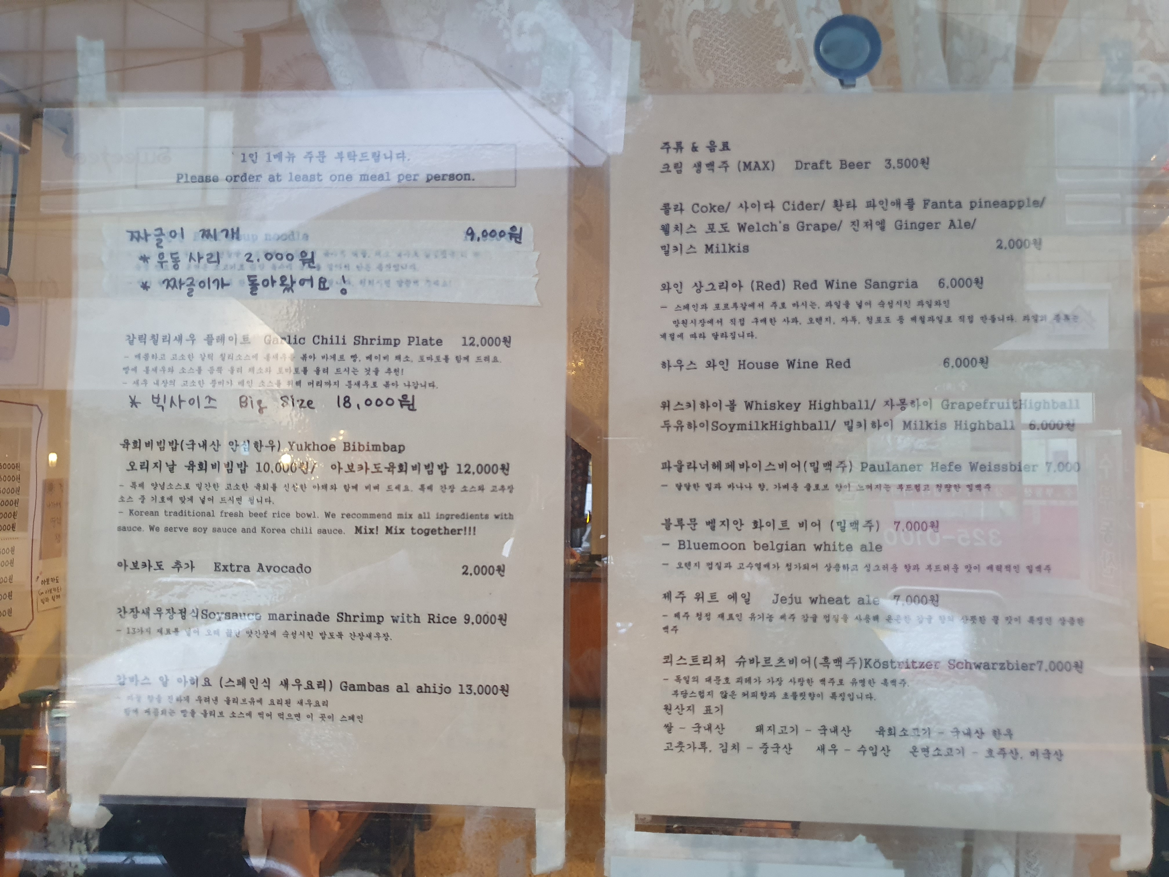 태양식당 메뉴판입니다. 메인은 짜글이와 갈릭새우플레이트입니다. 간혹 육회비빔밥과 간장새우를 드시는 분들이 계셨지만 테이블에 짜글이와 갈릭새우플레이트는 기본이더라구요. 그래서 저희도 짜글이와 갈릭새우 플레이트로 주문했습니다.