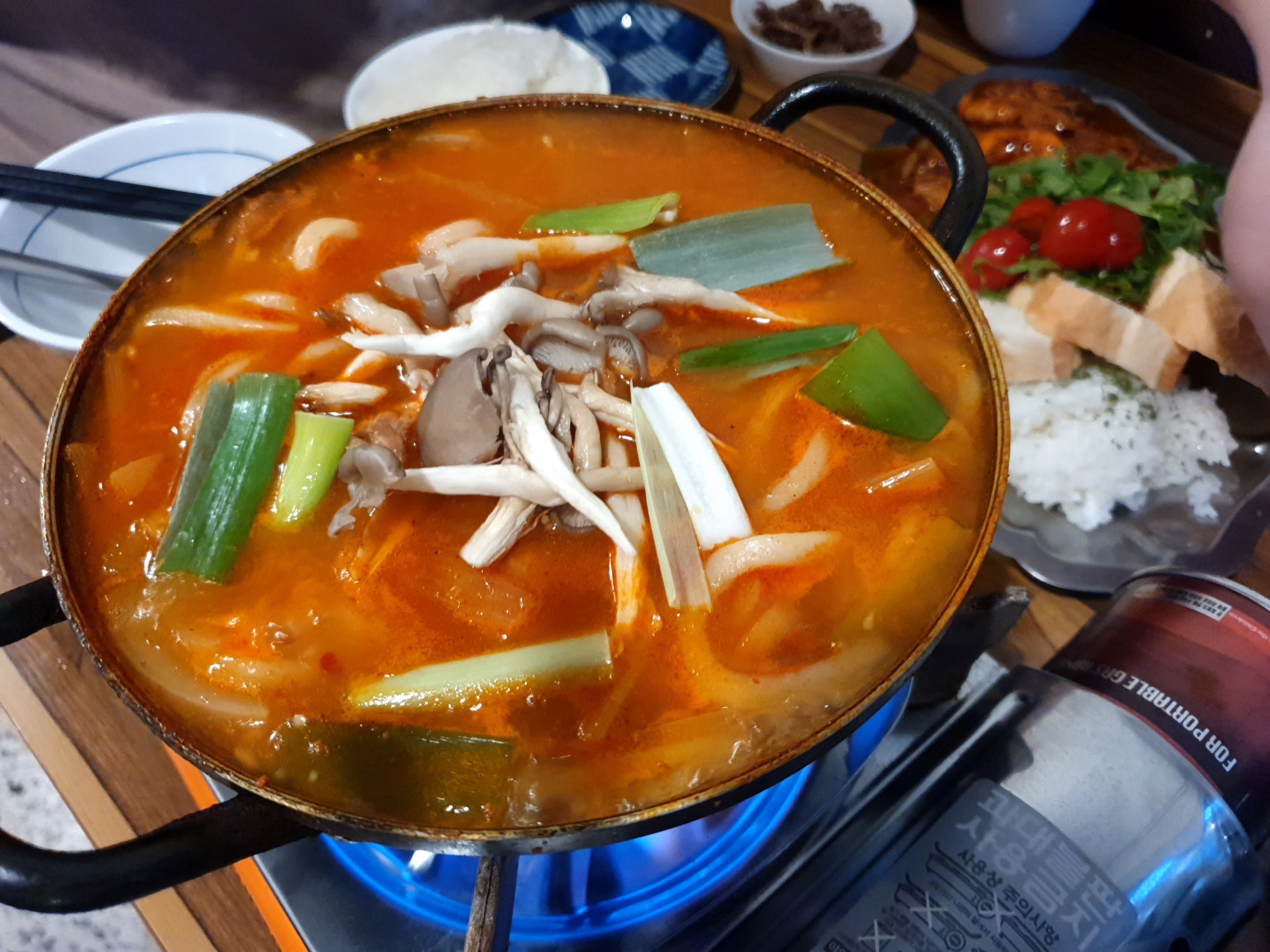 금방 짜글이도 나왔어요. 짜글이는 우동추가를 했어요. 1인 냄비에 우동이 한가득 나왔어요. 워낙 냄비가 작아서 먹다보니 우동을 그렇게 많지는 않았네요. 짜글이는 한소큼 끓이니 맛있어졌어요. 짜글이에 들어있는 고기가 정말 맛있어요. 고소하고 쫄깃쫄깃하답니다. 다만 고기가 많이 들어있지는 않네요. 그래도 우동을 건져먹고 밥과 함께하니 너무 맛있어요.