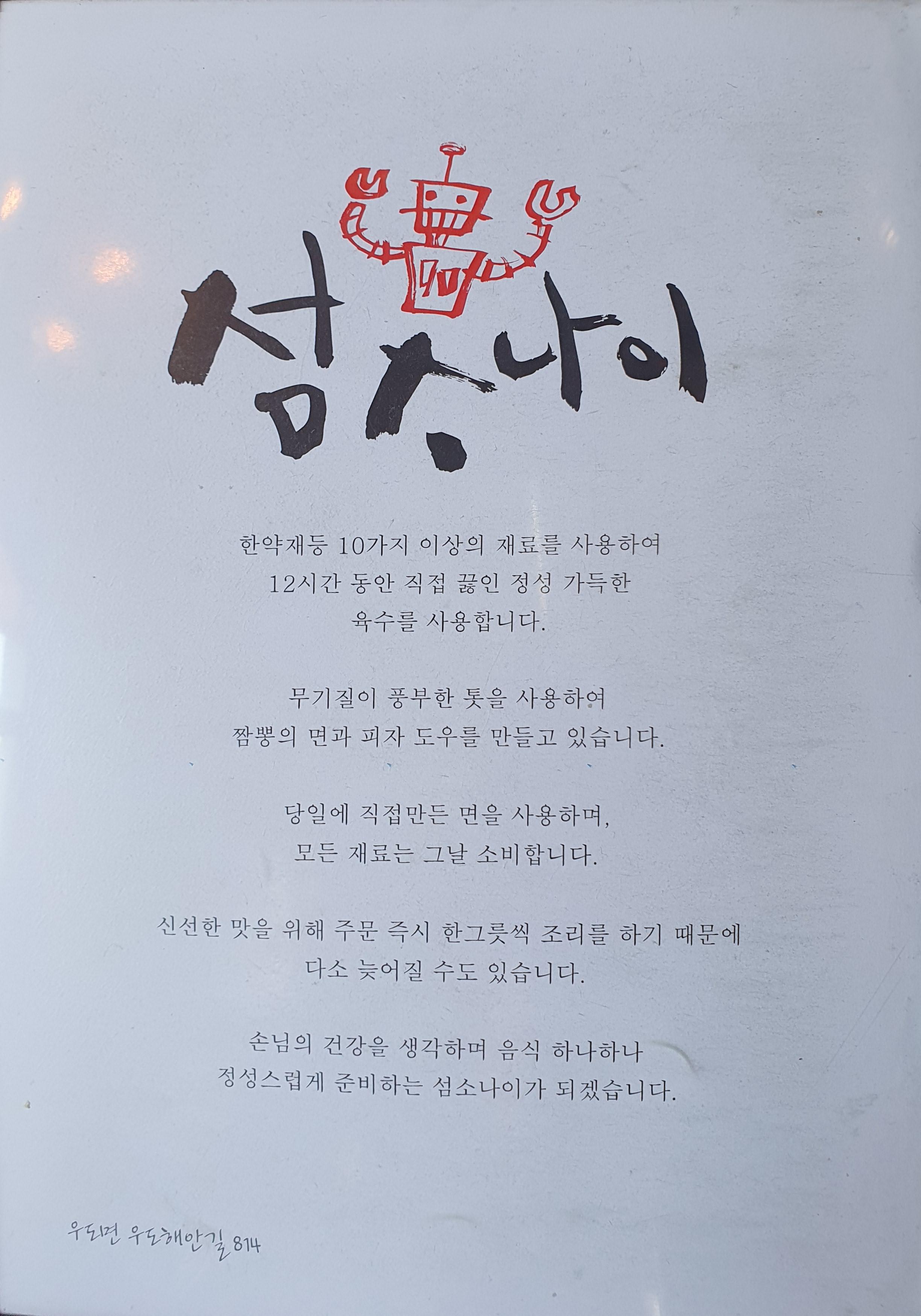 그래서 제주 짬뽕 맛집을 찾고 있었는데 우도 섬소나이를 많이 추천해주시더라구요. 그래서 제주여행 짤때부터 미리 포함을 시켰어요. 섬소나이는 우도에 있어서 배타고 들어가야 하기때문에 제주 동쪽에 방문하는날 하루정도 날 잡고 들어가셔야 해요.