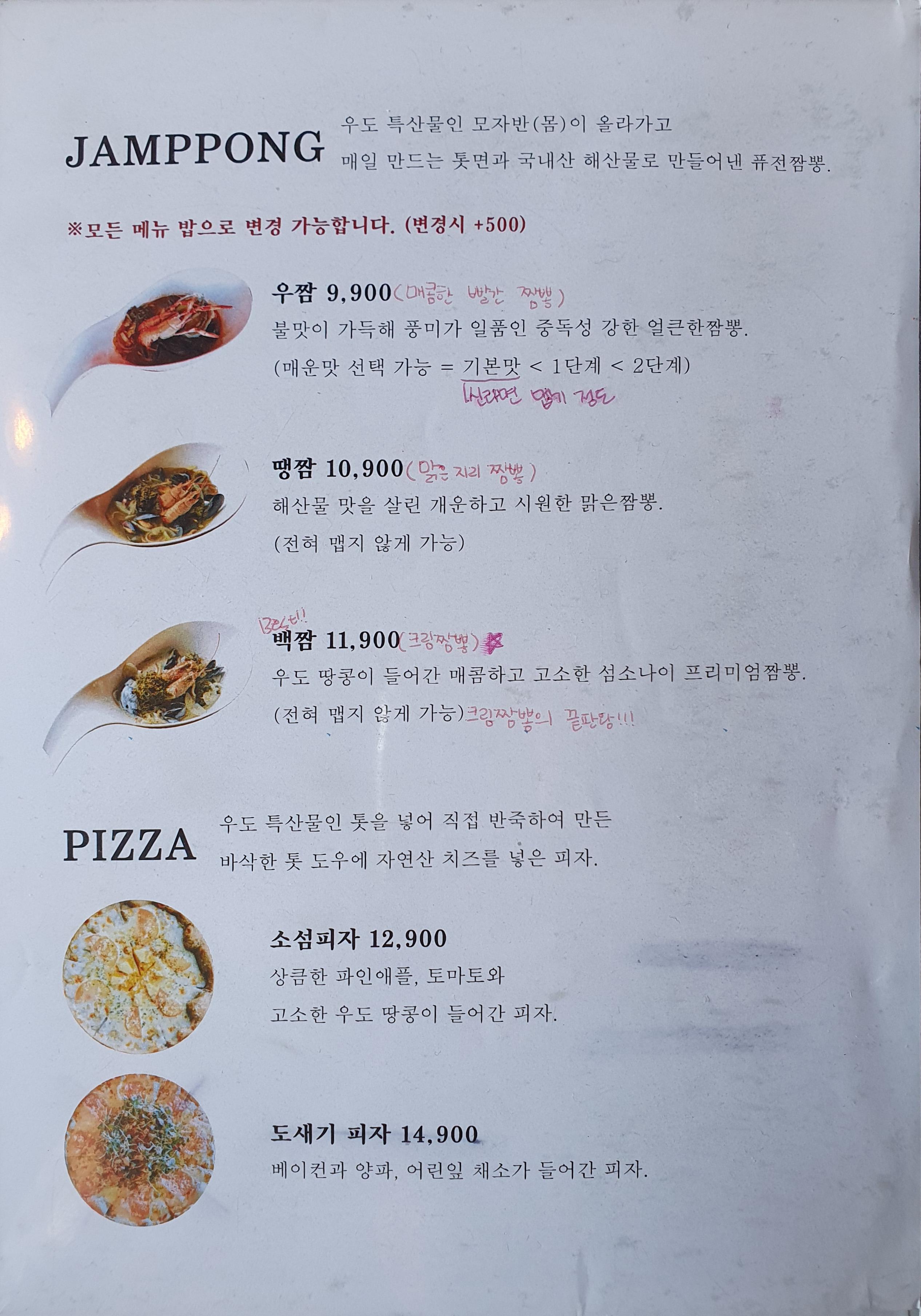 우짬은 불맛 가득한 해산물 짬뽕이예요. 보통 우리가 많이 먹는 짬뽕이예요. 근데 진짜 불맛한가득. 해산물 한가득. 우도 바다를 이 한그릇에 담은 느낌이예요. 게다 딱새우 등이 갈라져 있는거 보이시나요. 원래딱새우는 껍질이 두꺼워서 국물요리에 들어가 있으면 속살 먹기가 힘든데.. 저 칼집으로 가운데가 사악 ~ 벌어져서 젓가락으로 속속 먹을 수 있어요. 새우 킬러인 제가 모두다 흡입햇죠 ㅎㅎ 아 진짜 또 생각나네요.. 게다 면발더 진짜 탱탱하고 맛있어요. 시중의 짬뽕의 면이 아니예요. 톳을 넣고 만든다고 메뉴판에 적혀있었는데 몸에만 좋은 것이 아니고 면발이 쫄깃쫄깃해서 진짜 맛있어요.