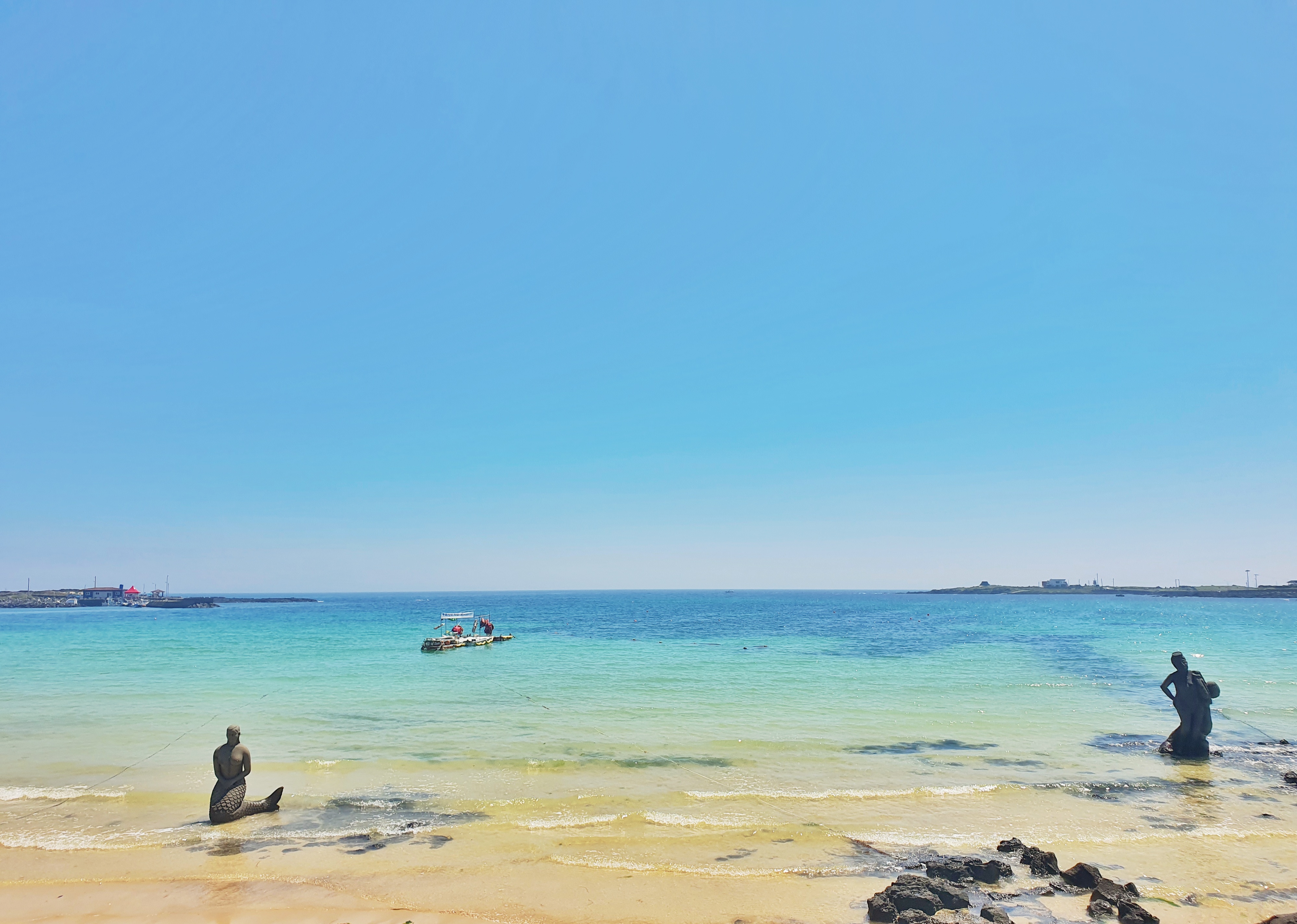 섬소나이 앞 바다 풍경이예요. 섬소나이는 하고수동해수욕장 바로 앞에있어요. 우도에서 애기들 데리고 놀기에 가장 좋은 해수욕장이라고 해요. 물이 잔잔하고 얇게 넓게 퍼져있아서 위험하지 않게 놀수 있어요. 진짜 너무너무 이쁘죠. 이 풍경을 보면서 짬뽕을 먹는다니요♡ 아주 대박이예요.