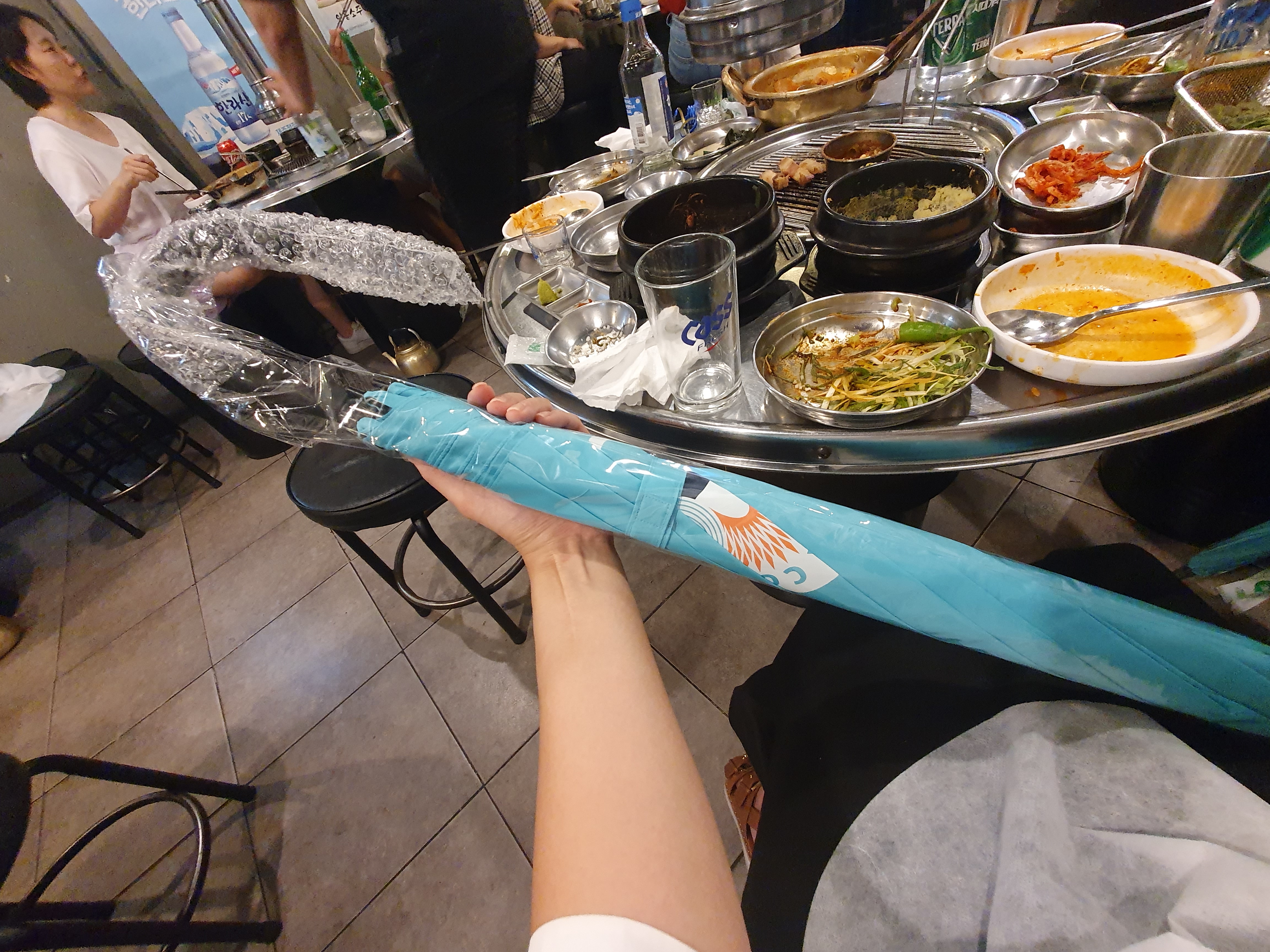 그리거 김돈이가 좋은이유는 제주 술을 맛볼수 있다는 장점이 있어요. 한라산 소주를 서울에서 맛보기 힘든데 김돈이 에서는 한라산도 팔고 제주에일도 팔고있었어요. 게다 제주에일 3병 먹으면 우산을 주시네요!! 당당히 3병 먹고 우산 까지 받아왔습니다. 고기도 먹고 맥주도 먹고 우산도 받고 1석 3조했답니다. ㅎ