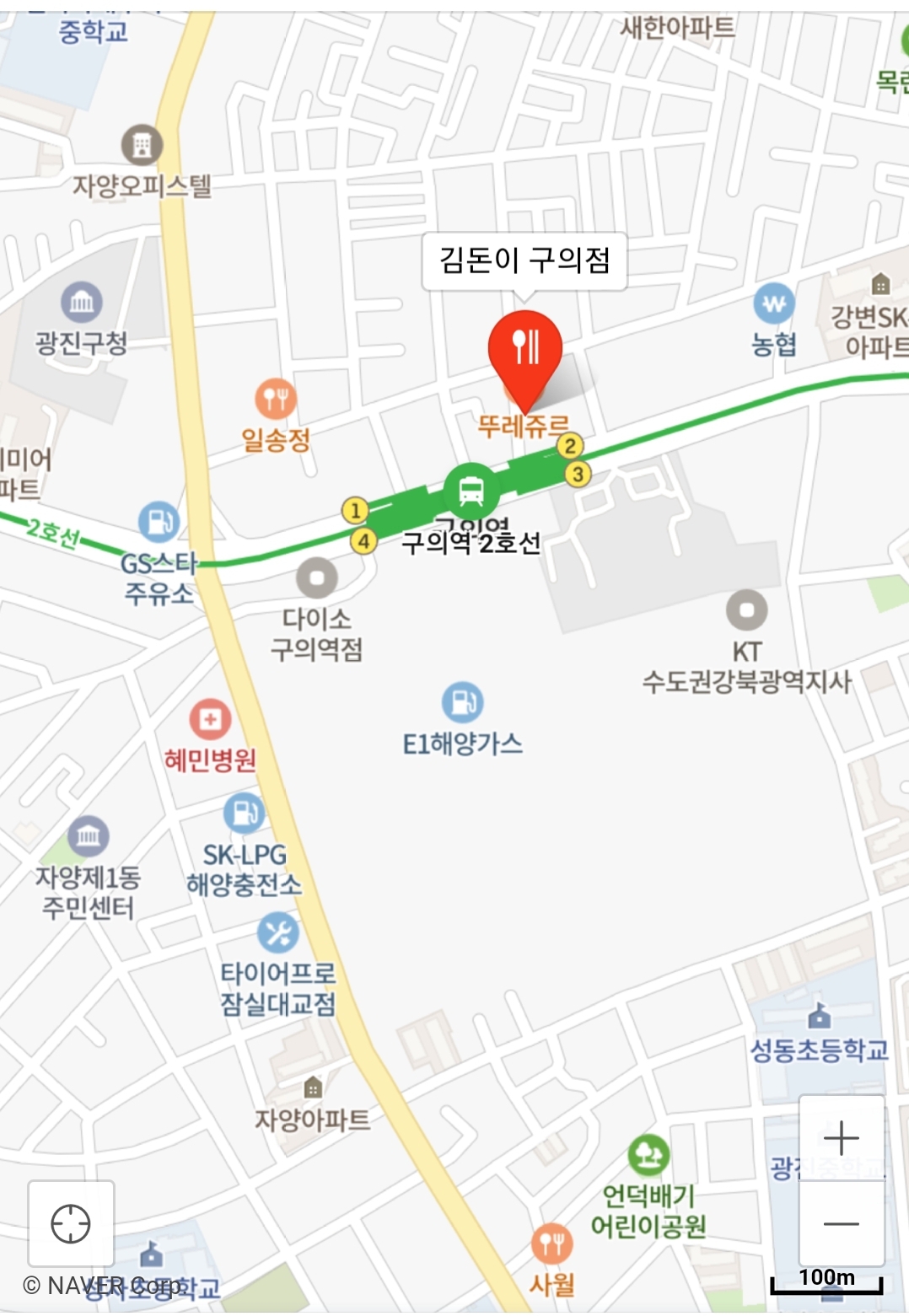 구의역 2번 출구에서 2분 정도 걸려요.