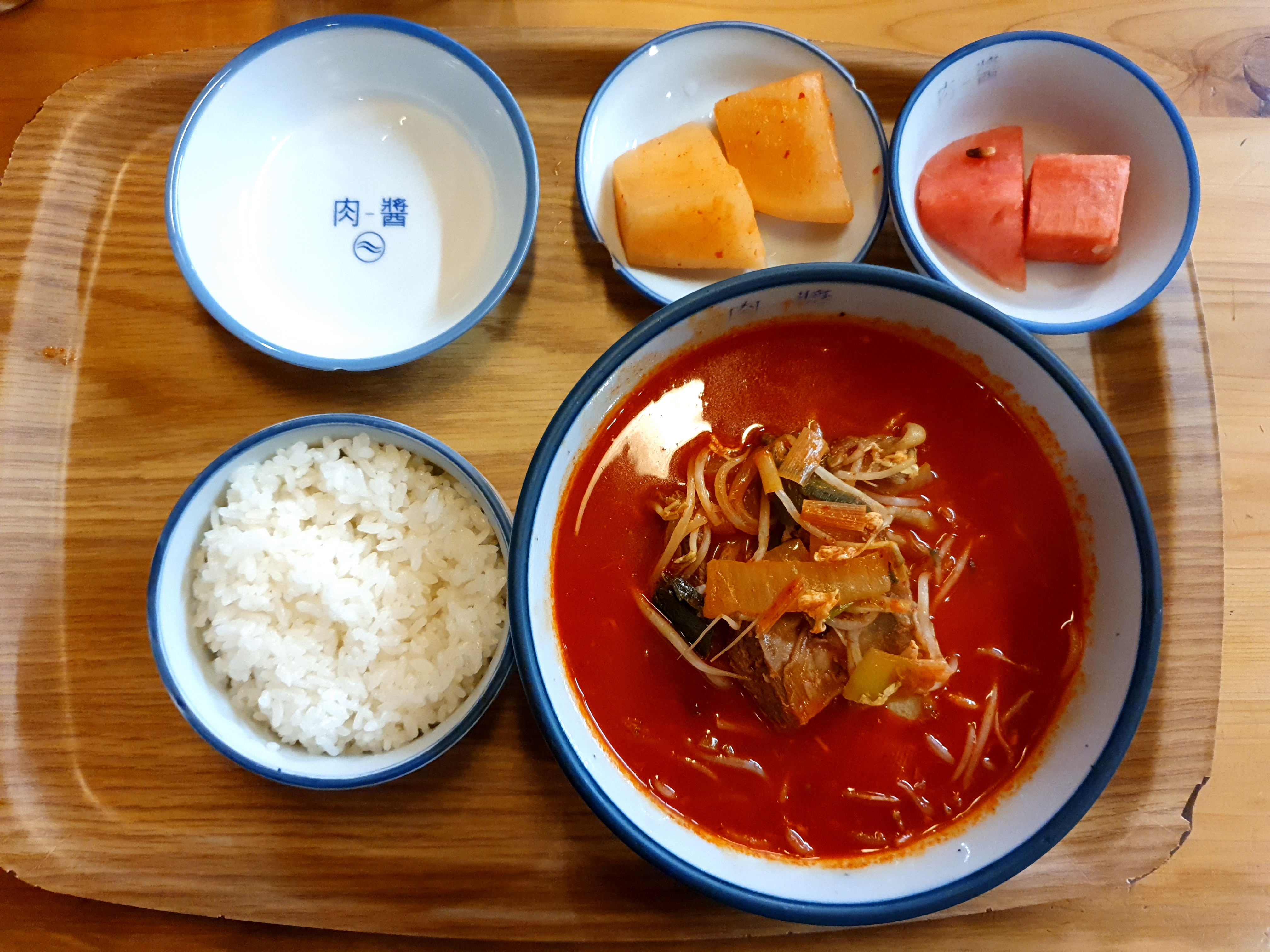 사진으로 보기에 매우 비슷해보이시죠. 위에가 육갈탕 아래가 육라면입니다. 각각 쟁반으로 나오는 데 빨리 먹고 싶더라구요. 엄청찐한 빨간 국물이예요