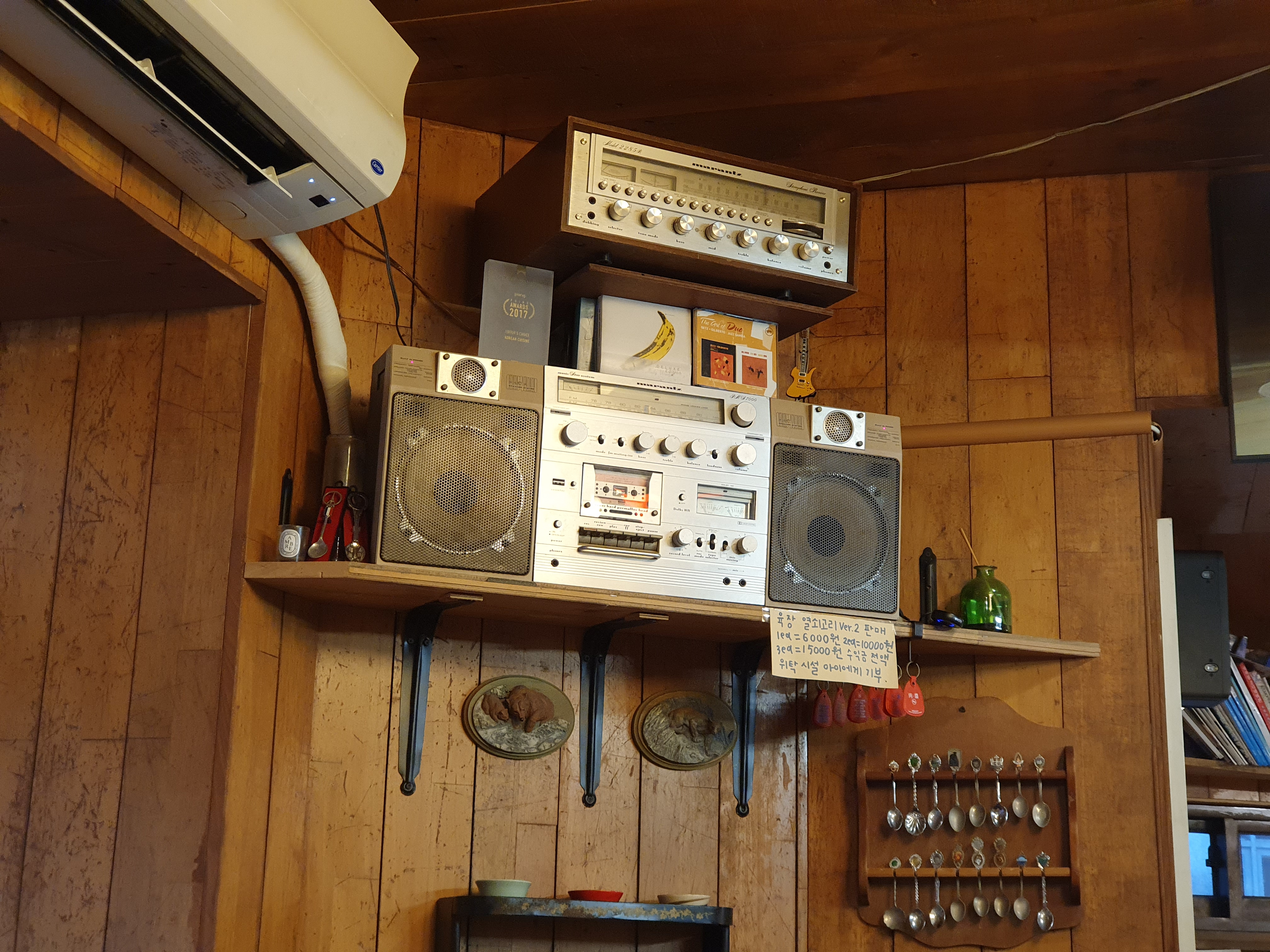 낡은 전축에서 째쯔가 나오고 있는데. 비 오는 오늘 날씨하고 정말 잘 어울렸어요. 목조주택에서 비오는날 낡은 전축에서 나오는 째즈가 살짝 울리는 느낌이 여행가서 좋은 카페에 와있는거 같았습니다.