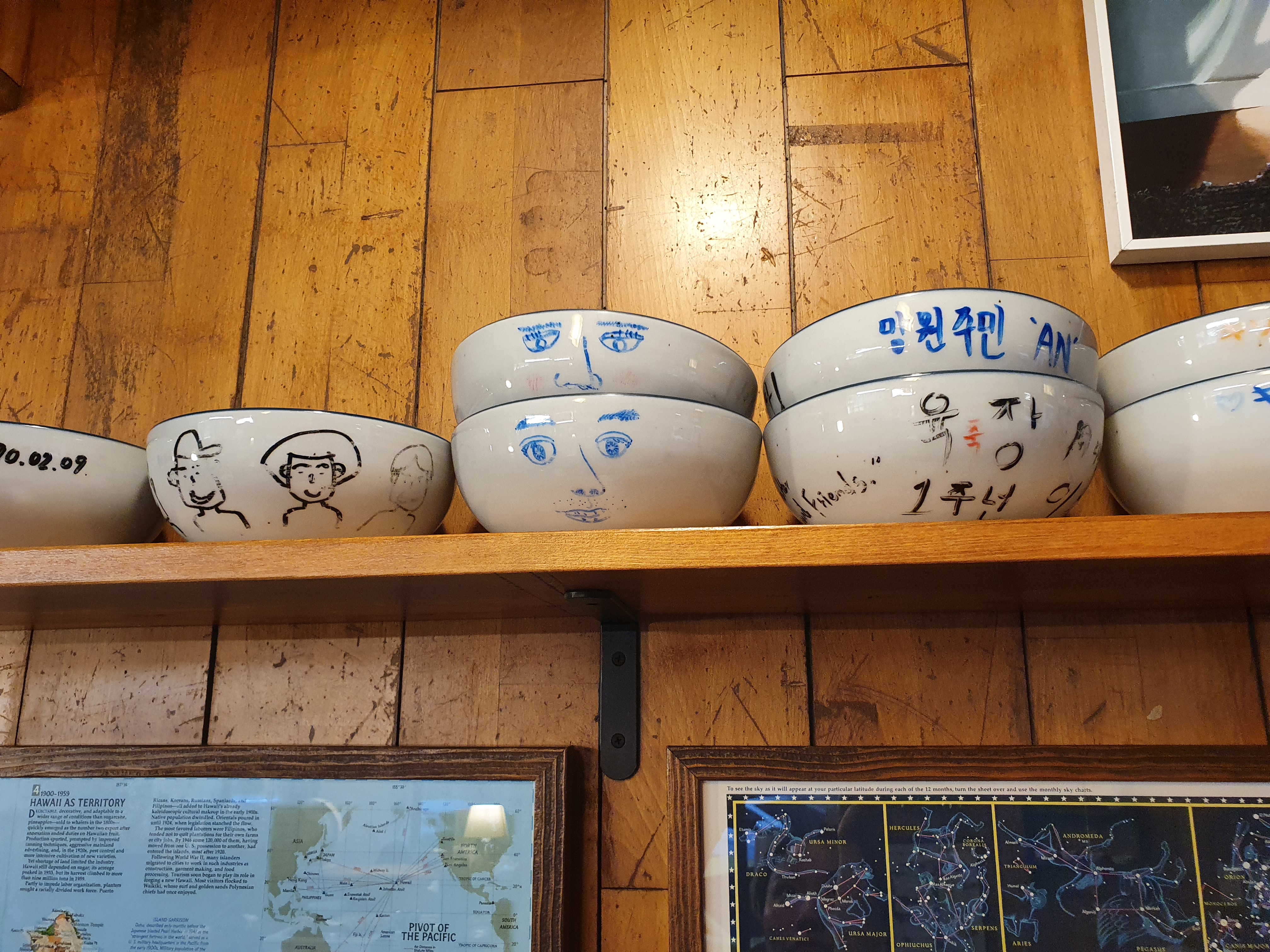 한쪽 벽에는 육개장 그릇에 그림을 그려서 디피해놓았는데 사장님들의 그림세계를 알수 있었어요. ㅎㅎ