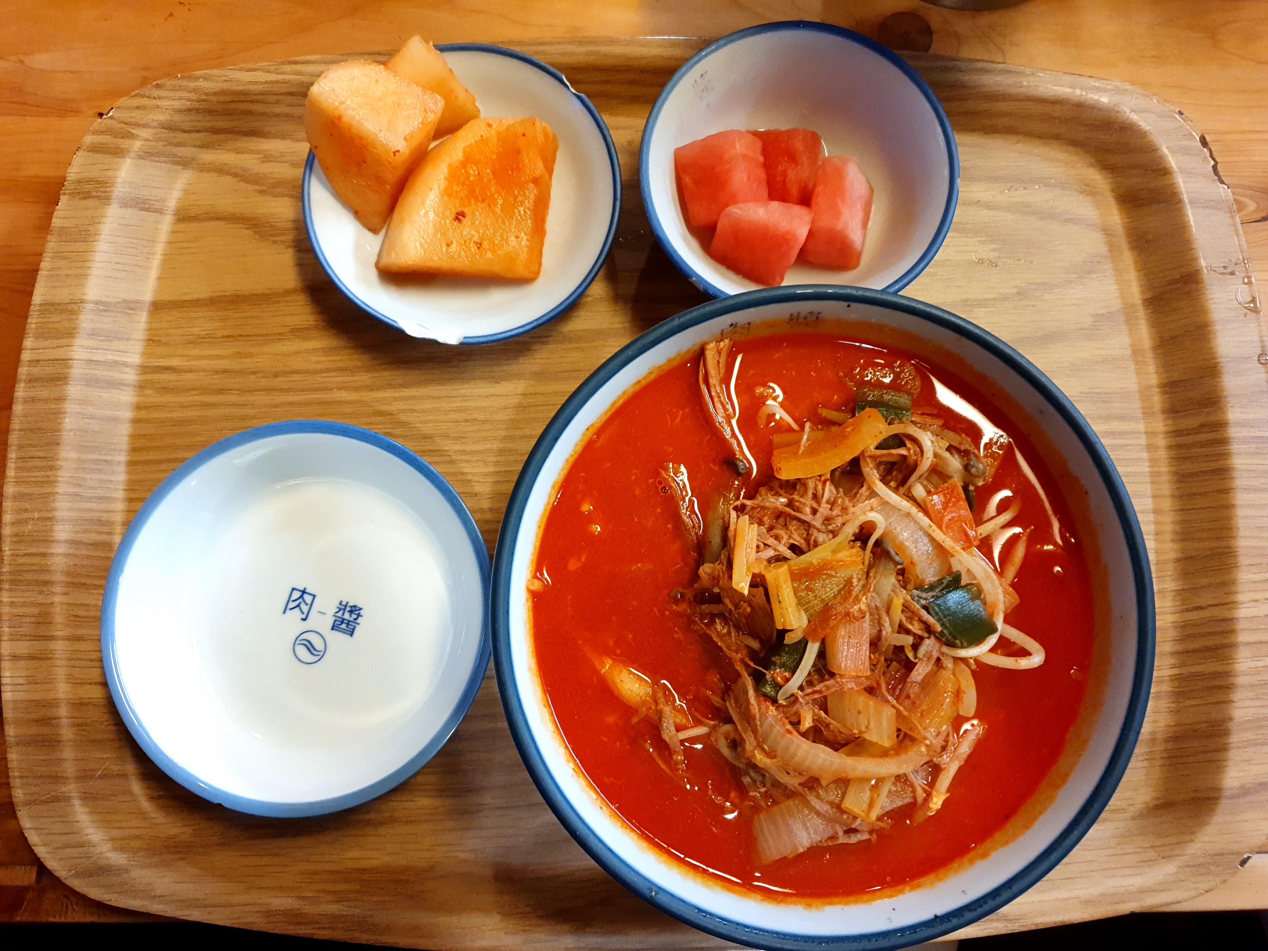 사진으로 보기에 매우 비슷해보이시죠. 위에가 육갈탕 아래가 육라면입니다. 각각 쟁반으로 나오는 데 빨리 먹고 싶더라구요. 엄청찐한 빨간 국물이예요