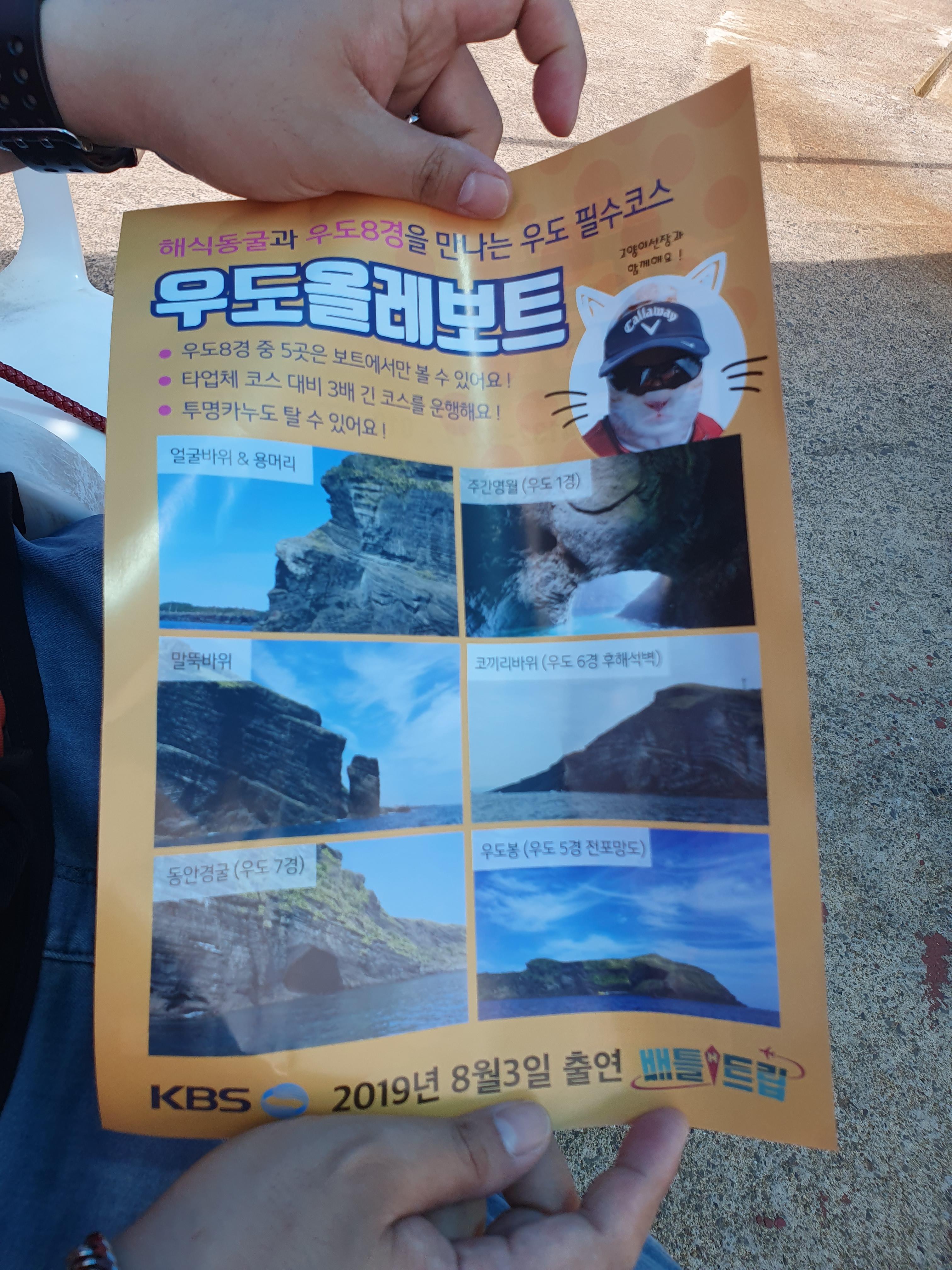암튼 우도에는 8경이 있다고 해요. 그중 5경은 보트를 타야만 볼 수 있다고 하니, 꼭 우도올레보트를 타야하는 구나 싶었습니다. 우도1경 주간명월, 우도2경 말뚝바위, 우도5경 전포망도 우도봉, 우도6경 후해석벽 코끼리바위, 우도7경 동안경굴을 볼 수 있습니다!!