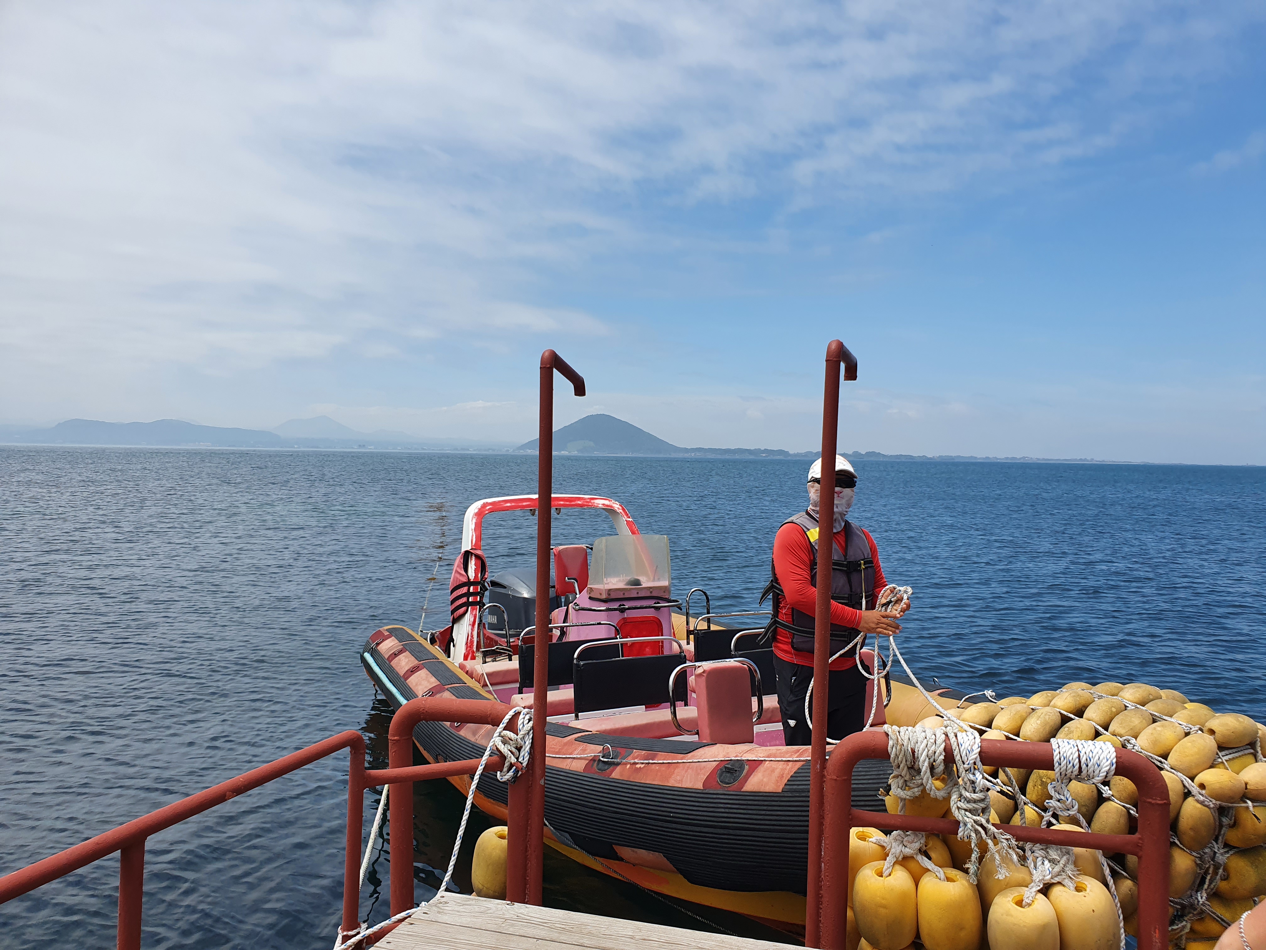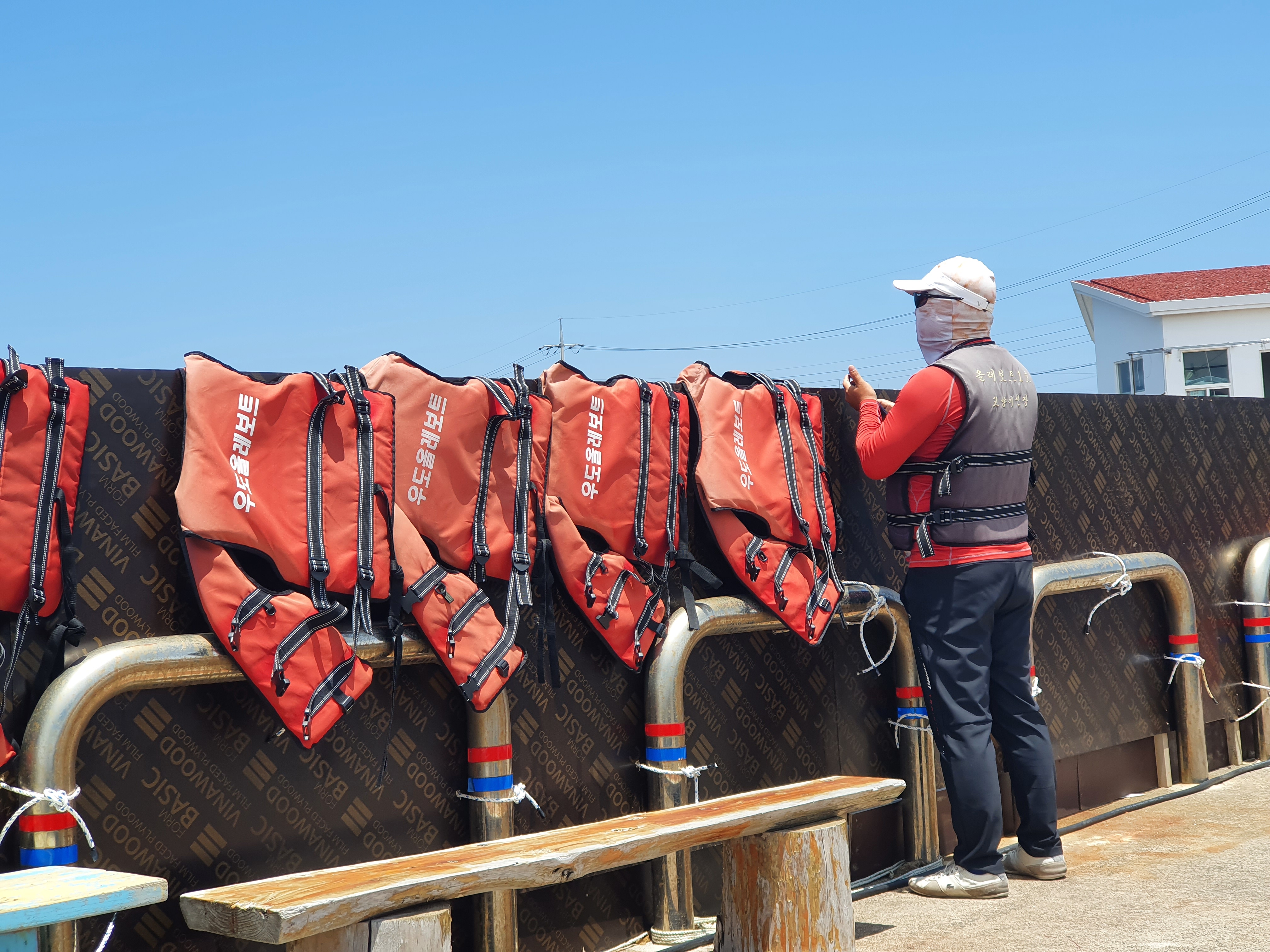 그래서 저희는 우도보트를 곧 탑승합니다. 탑승전에 바짝 마른 구명조끼를 입고 보트가 도착하기를 기다렸어요.