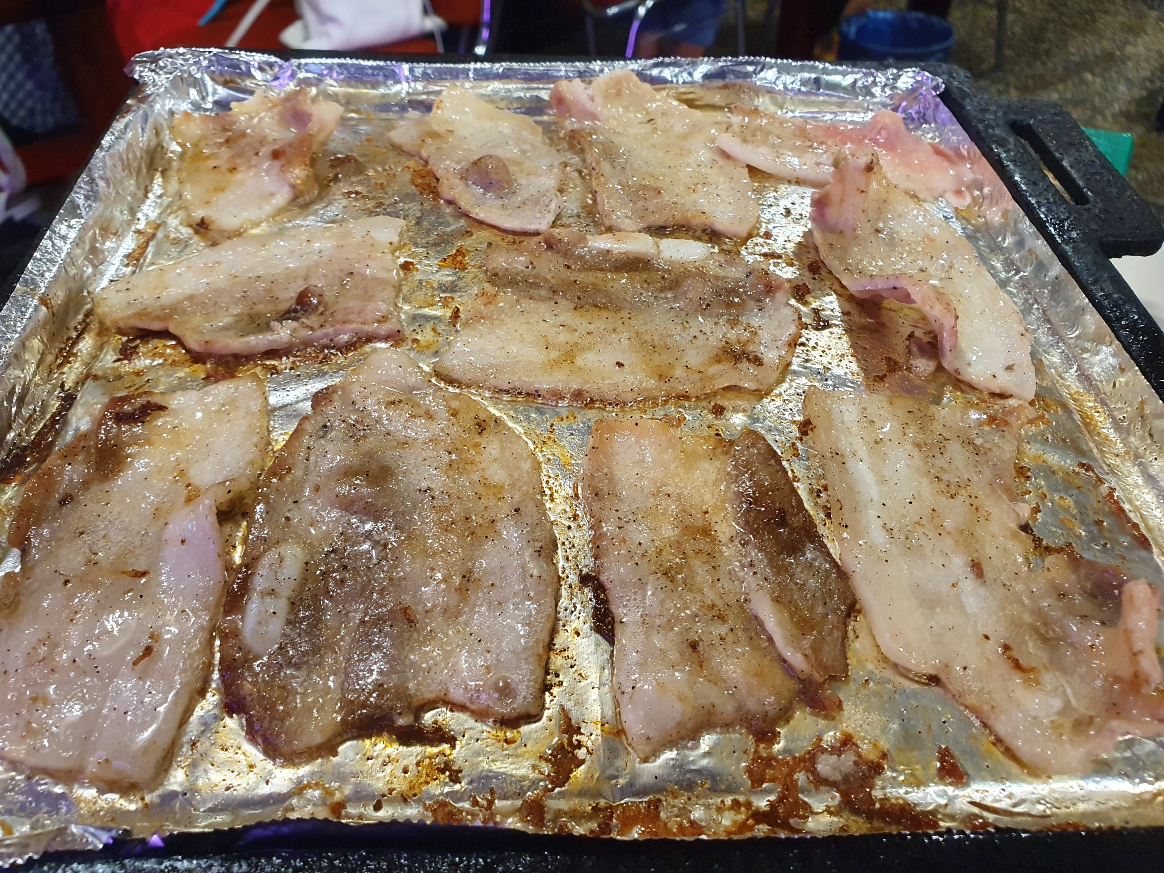 드디어 냉동삼겹살이 나왔습니다. 한그릇이 1인분이예요. 불판을 딱 채우죠. 후추를 많이 뿌리면 더 많있어요. 후추 탁탁 해보세요.