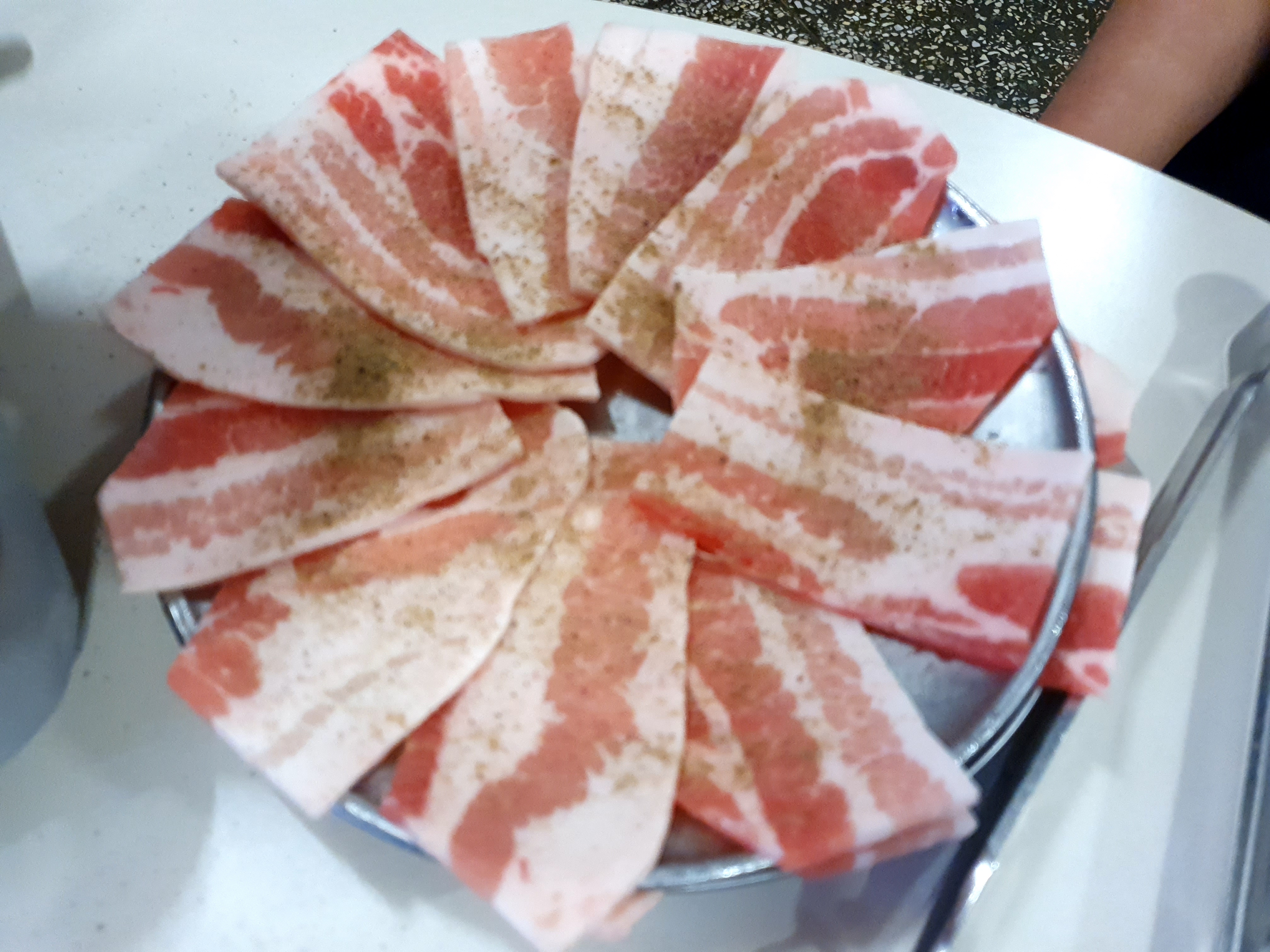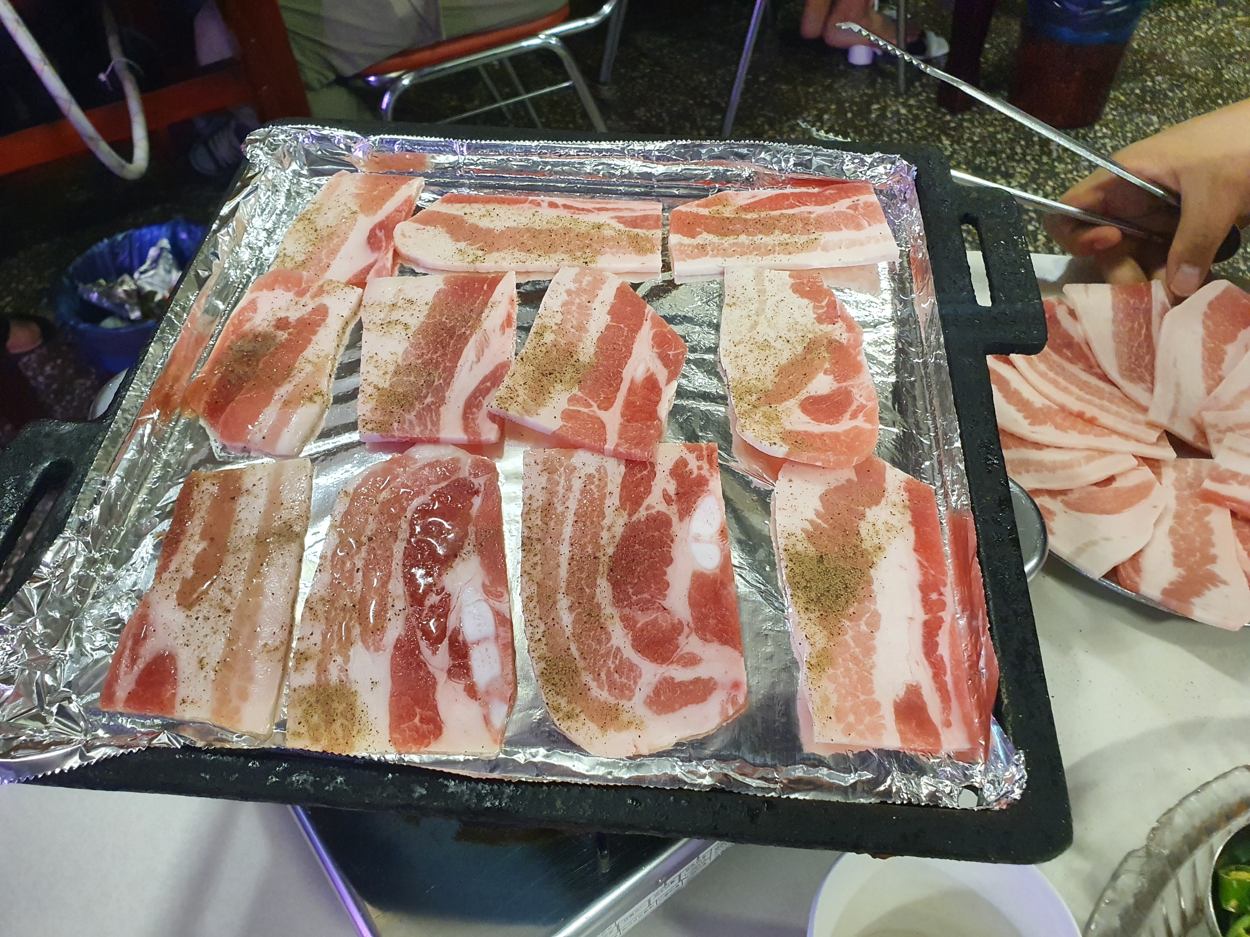 드디어 냉동삼겹살이 나왔습니다. 한그릇이 1인분이예요. 불판을 딱 채우죠. 후추를 많이 뿌리면 더 많있어요. 후추 탁탁 해보세요.