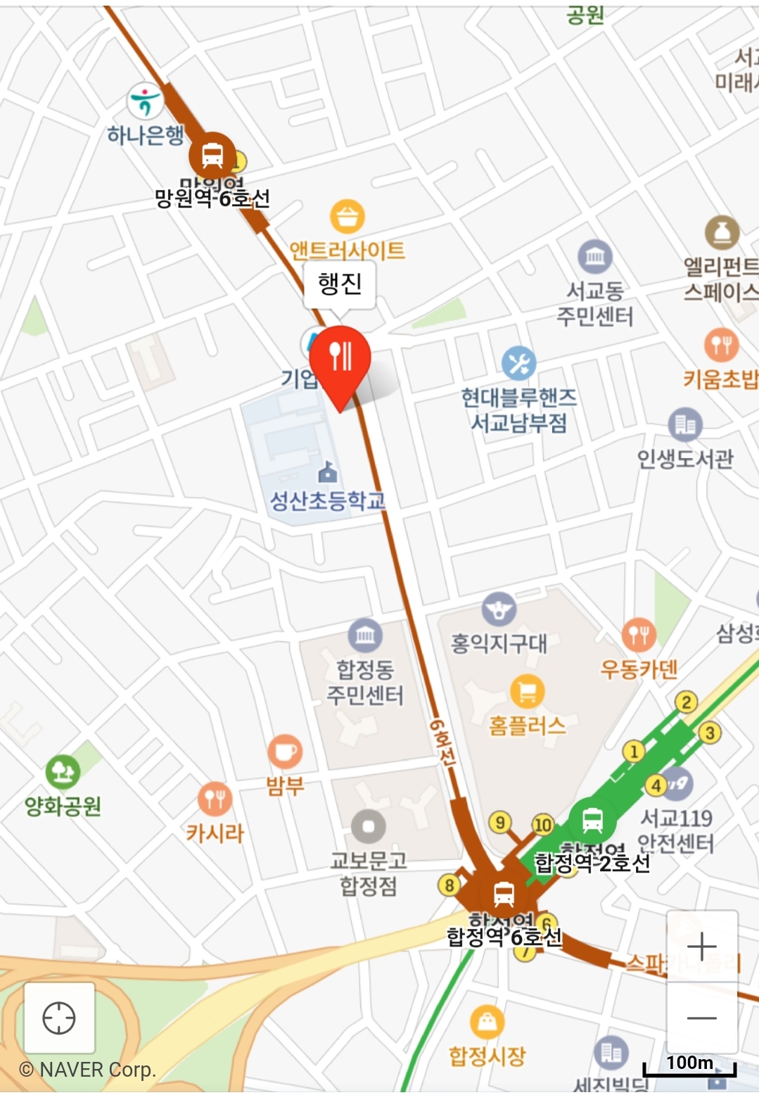 합정역보다 망원역이 가까워요. 망원역 도보 5분정도 걸려요.
