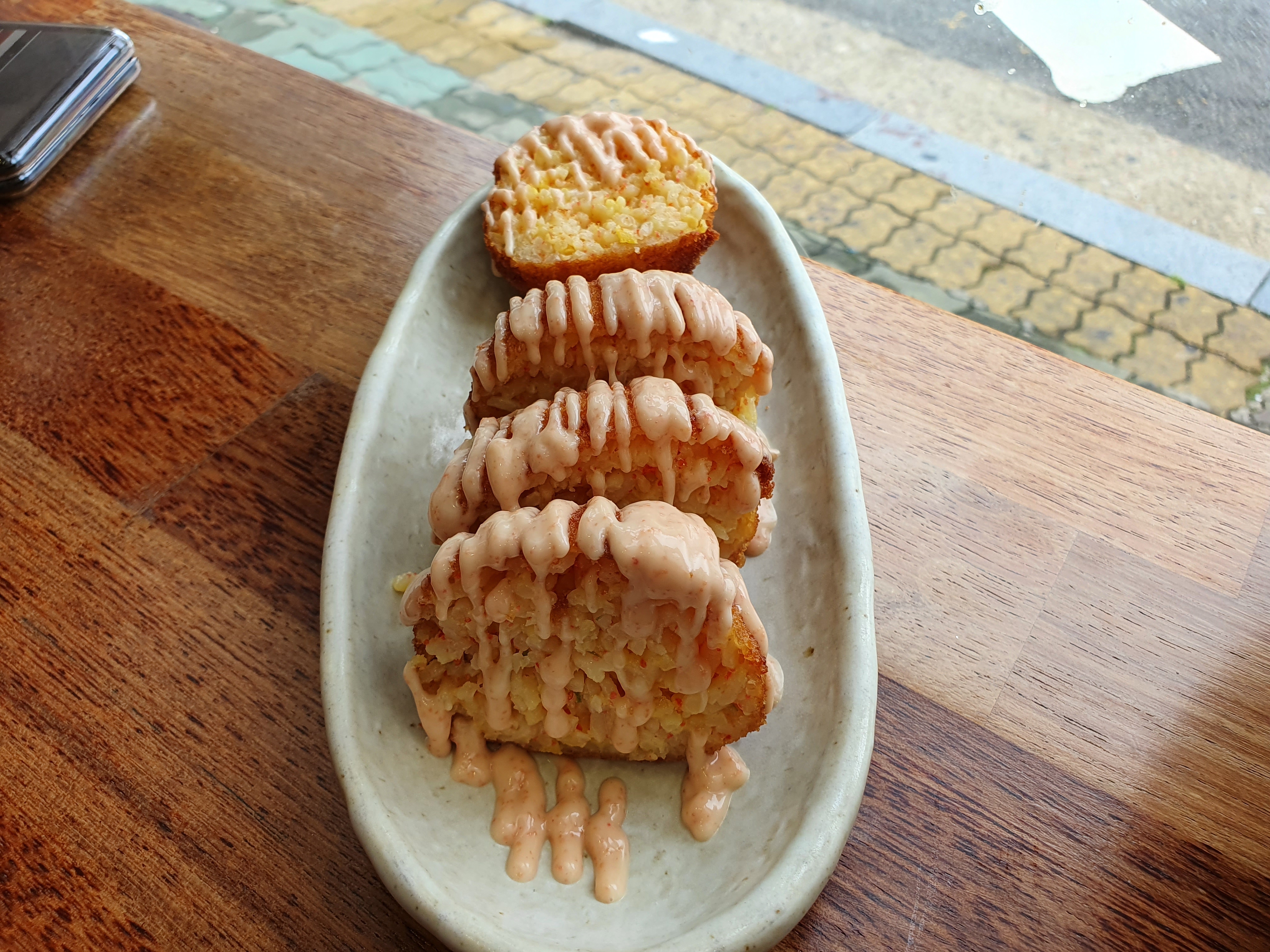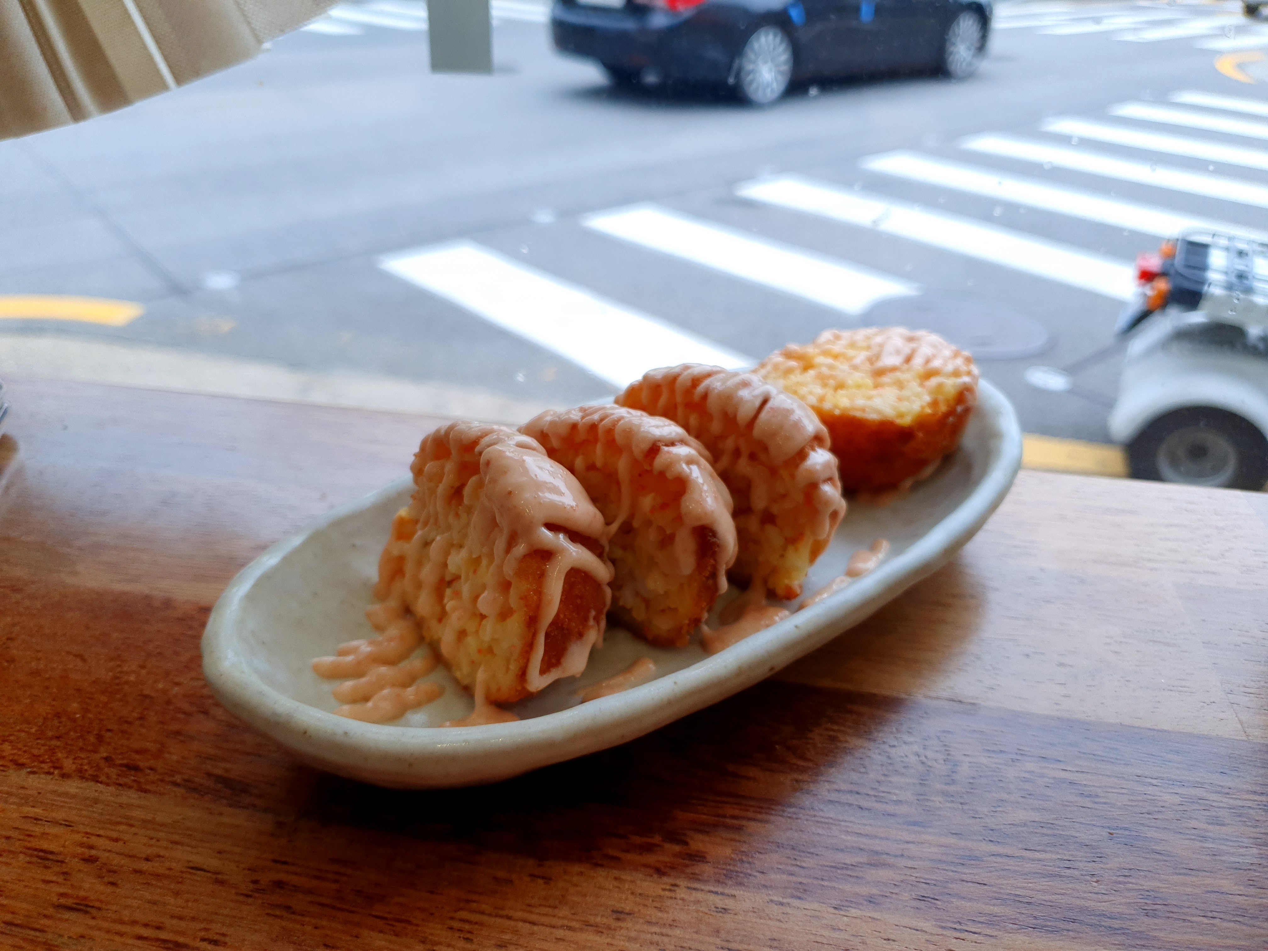 명란마요가 뿌려진 주먹밥튀김도 나왓어요. 튀김이다보니 시간이 조금 걸렸던거같아요. 바로 튀긴걸 먹으니 겉에가 바삭바삭 맛있엇어요. 근데 먼가 바로 해주신거같은데 냉동같은 맛이 살짝 났어요. 조금 이상했어요. 방금 만든듯한 주먹밥을 튀겨주셨는데말이죠. 그래서 조금 아쉬웠어요.