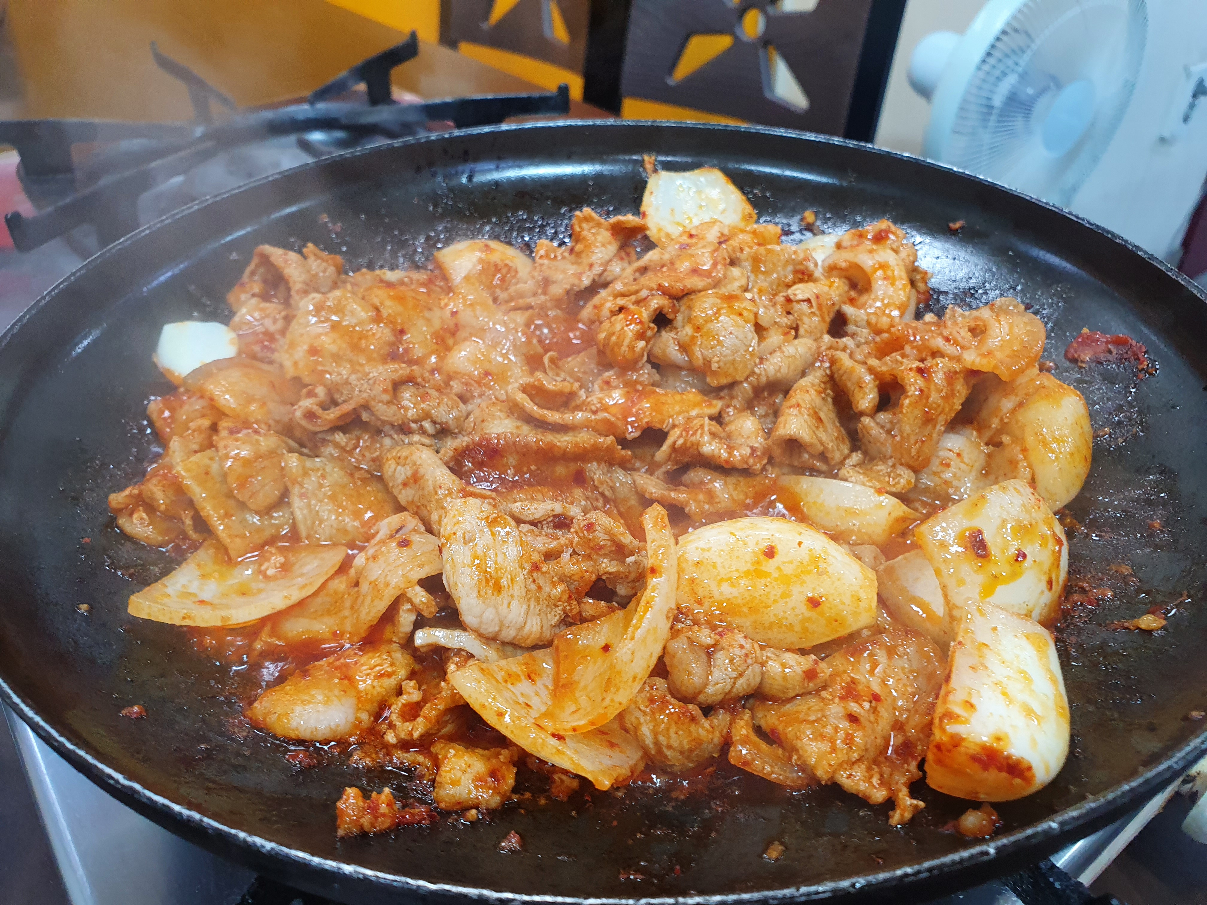얼마 지나지않아 고추장불백이 나왔습니다. 거의 익혀서 나와서 잠깐만 데펴서 먹으면 됩니다. 양파와 고기가 함께 나오는데요. 저희는 반찬으로 나온 생마늘과 오뎅을 넣거 팔팔 끓여서 먹기 시작합니다.