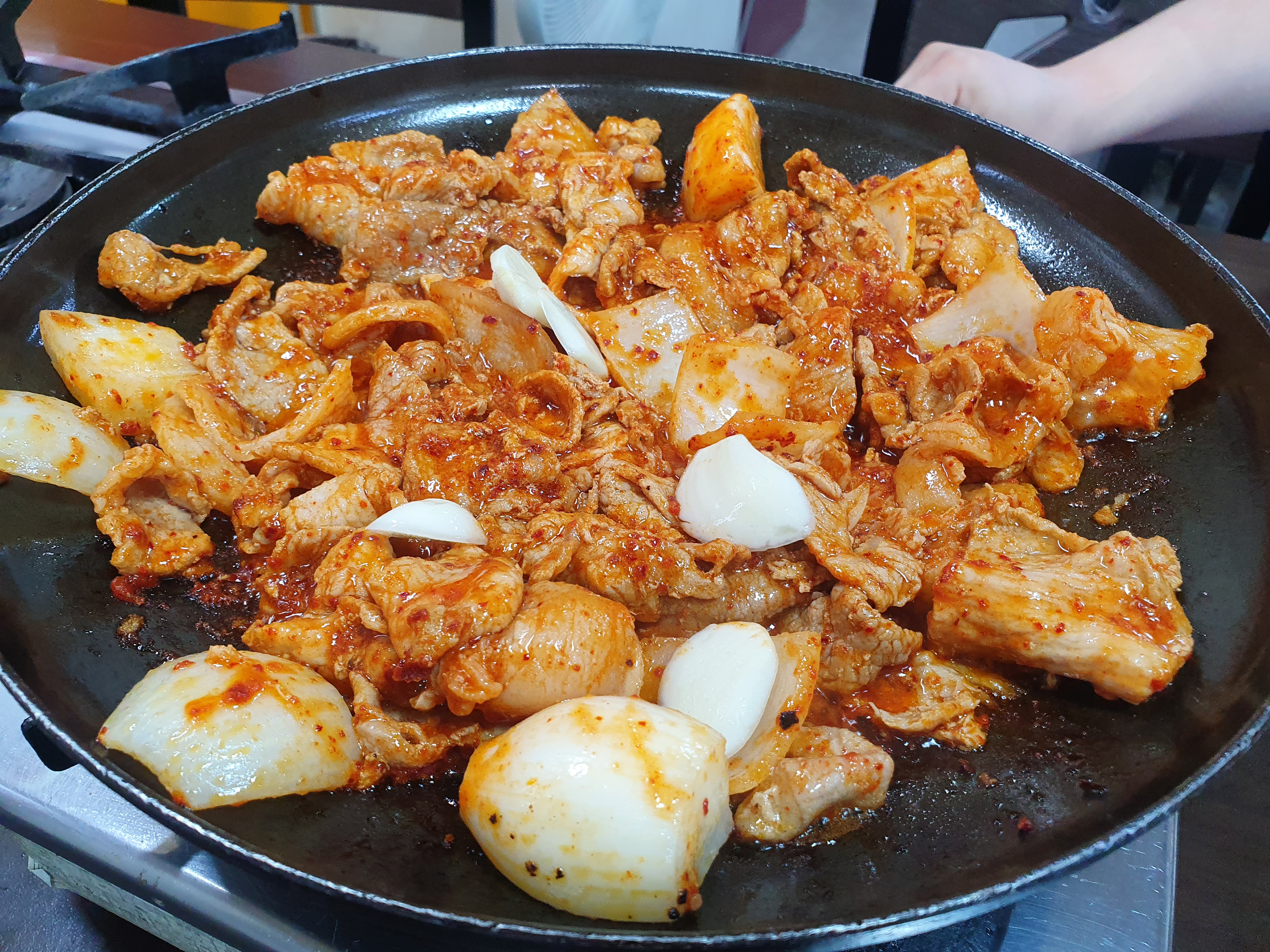 얼마 지나지않아 고추장불백이 나왔습니다. 거의 익혀서 나와서 잠깐만 데펴서 먹으면 됩니다. 양파와 고기가 함께 나오는데요. 저희는 반찬으로 나온 생마늘과 오뎅을 넣거 팔팔 끓여서 먹기 시작합니다.