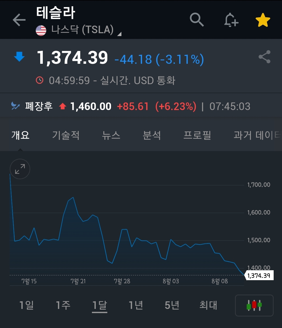 현재 테슬라 주가는 1,374.39로 전일 대비 3.11%하락했습니다. 테슬라 액면분할이 발표된 지금 시간 외 거래에서 1,460으로 6.23% 급등하고 있습니다.